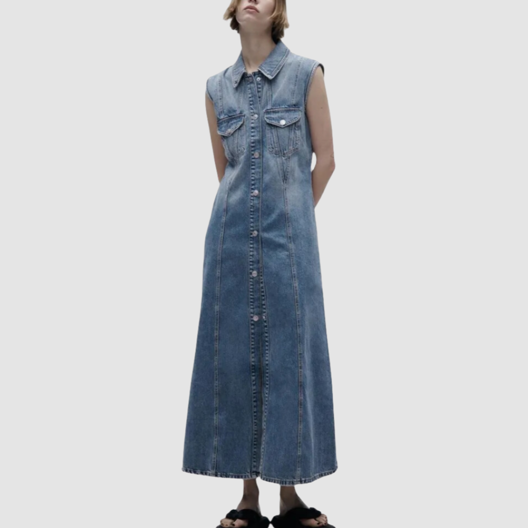 Introducing our versatile long-sleeveless denim dress. featuring a button-up front. two stylish breast pockets. and a classic collar.