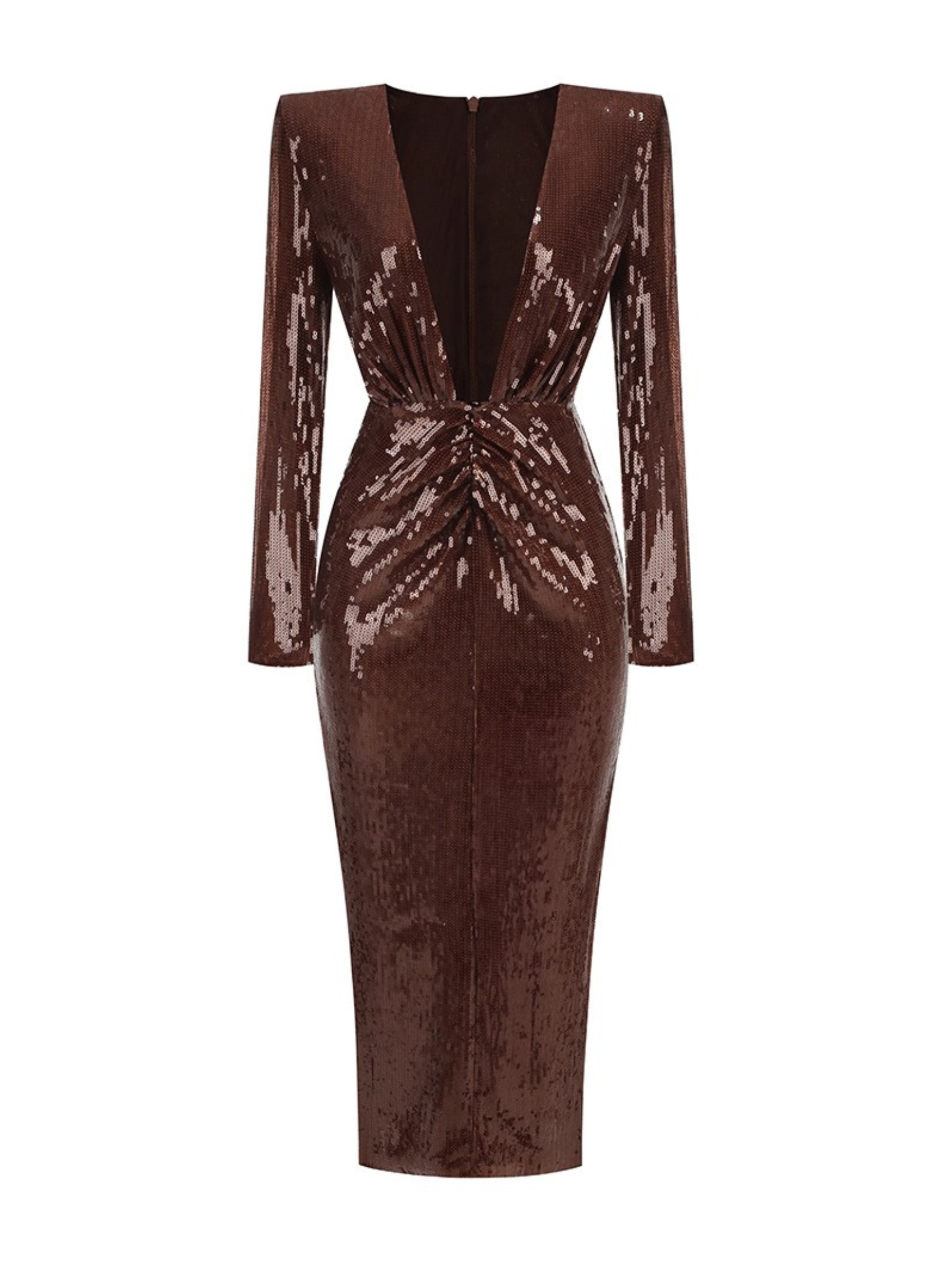 Elevate your evening elegance with this dazzling chocolate brown midi dress. designed to captivate from every angle. Adorned with shimmering sequins. it features a plunging V-neckline. a flattering ruched waist. and a body-hugging silhouette that accentuates your curves. The long sleeves and back slit add sophistication and comfort. making it the perfect statement piece for cocktail parties. formal dinners. or holiday celebrations.