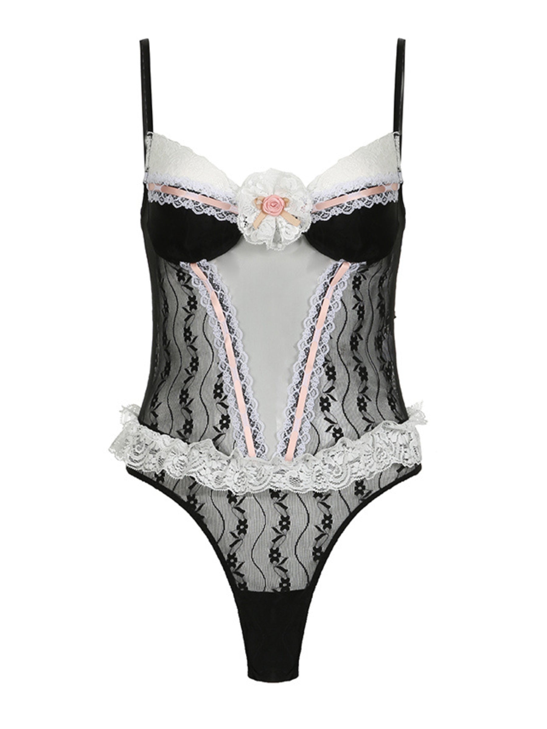Introducing the Giana Lace Bodysuit in Black from the Vivuki Modern Romance Collection. This one-piece features a floral detailed neck and ruffle lace waist for a romantic and elegant look. The slim fit and mesh top add a touch of sexiness. making it perfect for any French-style outfit. Available in both white and black.
