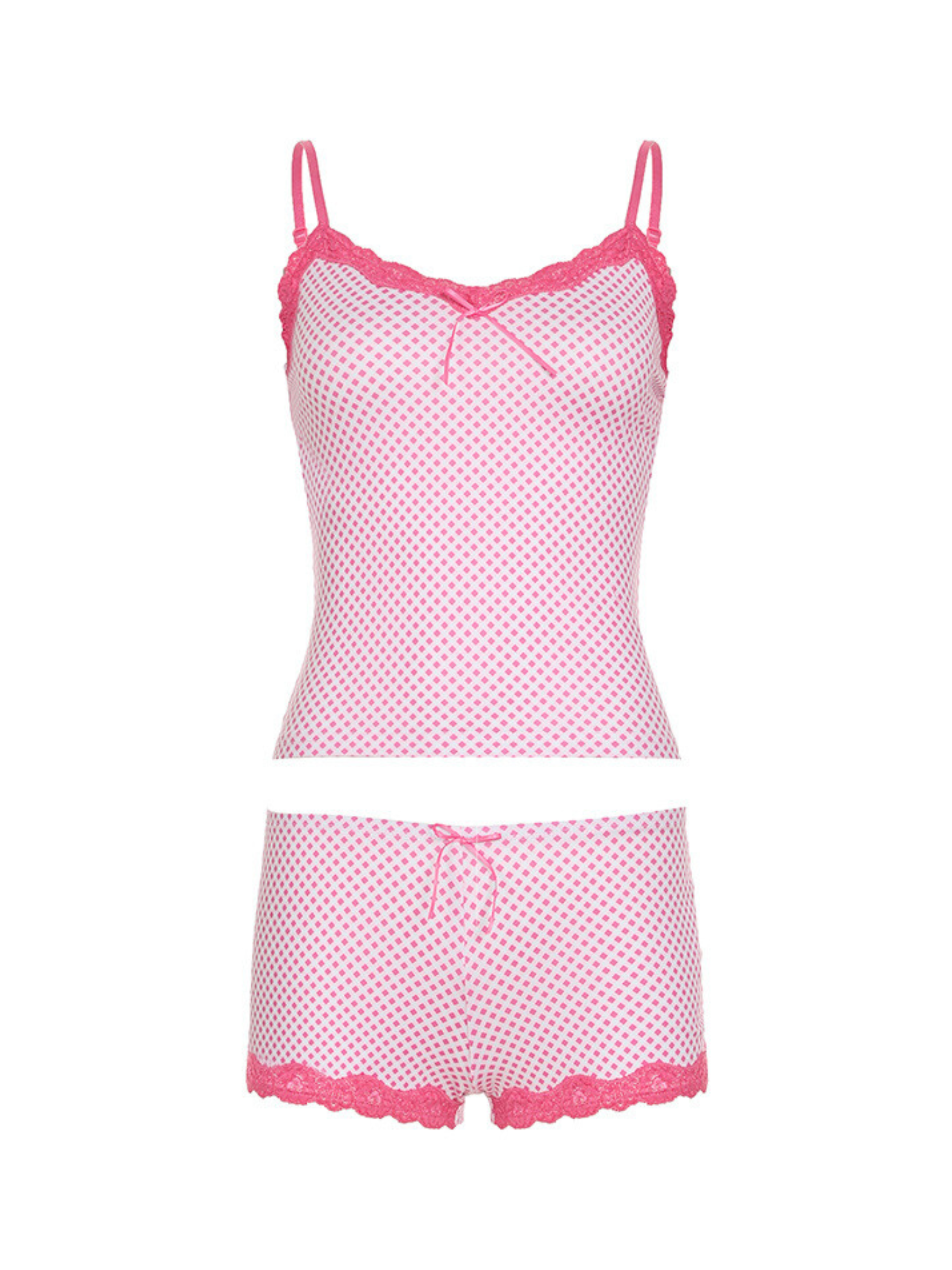 Soft. feminine. and effortlessly flirty �the Grace Pink Gingham Lace Trim Pajama Set is your new bedtime fave. This matching cami and shorts duo features an adorable pink gingham print with hot pink lace trim for a playful. vintage-inspired look. The adjustable straps and stretchy fabric ensure all-night comfort. while the delicate bow accents add a sweet finishing touch.