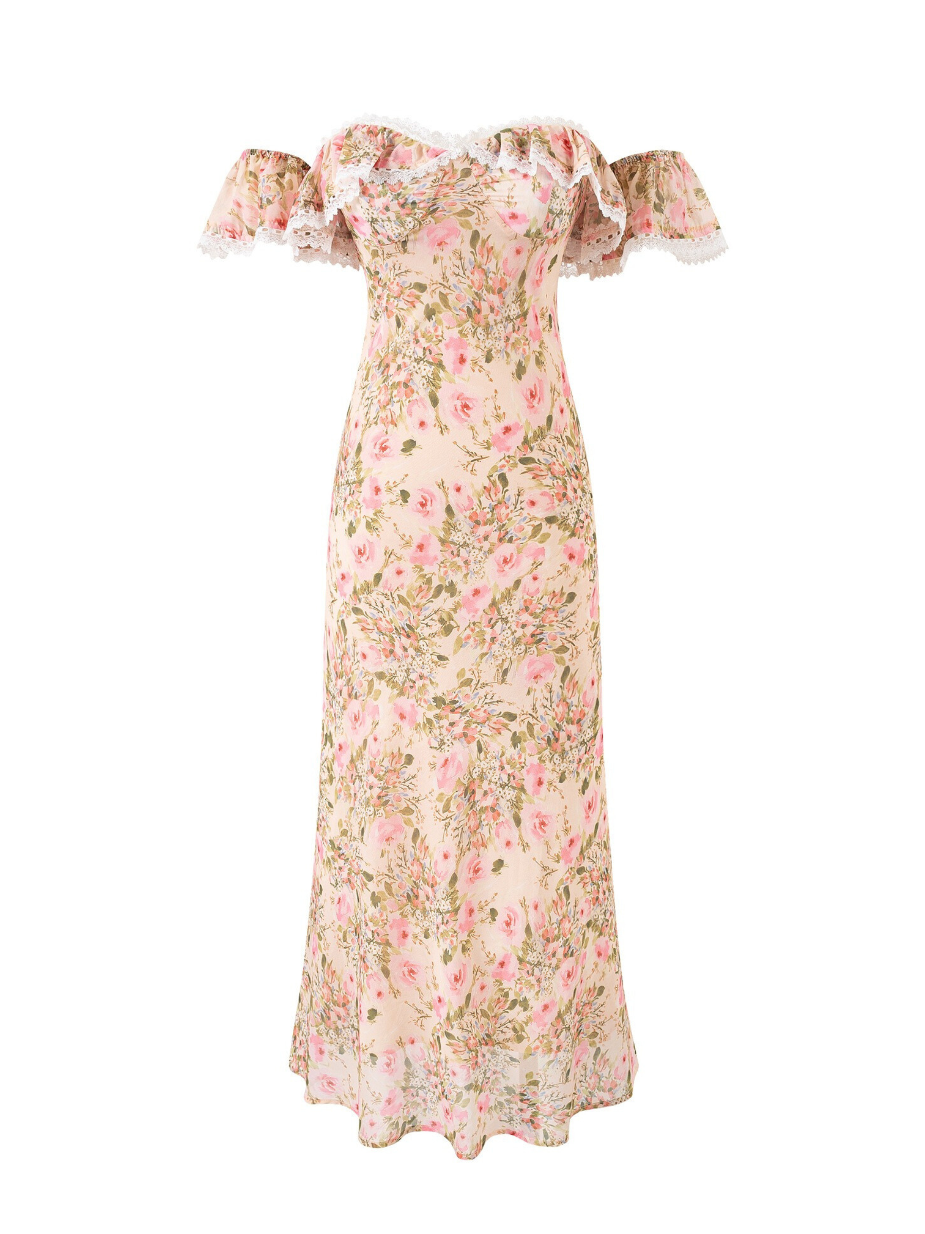 Step into romantic nostalgia with this dreamy off-the-shoulder dress. featuring delicate pink florals. a soft ruffled neckline trimmed in lace. and a flutter hem. The feminine silhouette hugs the waist and flares gently at the bottom. making it perfect for warm-weather picnics. cottagecore looks. or soft vintage styling.