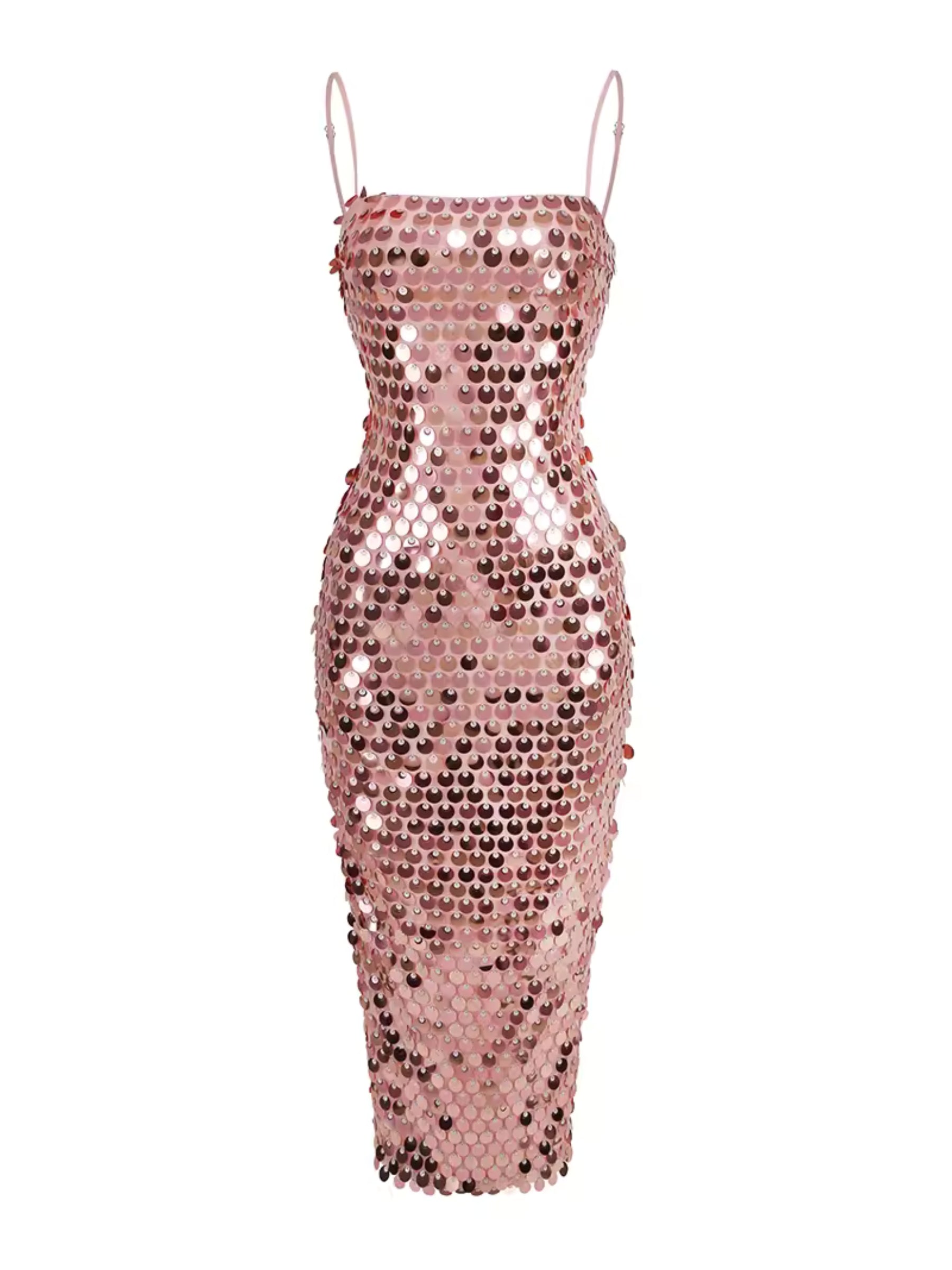 Shine like a star in the Ilsa Sequin Midi Dress! Delightfully elegant and chic. this dress features spaghetti straps and a high waist midi skirt. making it perfect for any party or cocktail event. Available in both pink and gold. it's a must-have from the Vivuki collection. Radiate confidence and style in this glamorous dress!