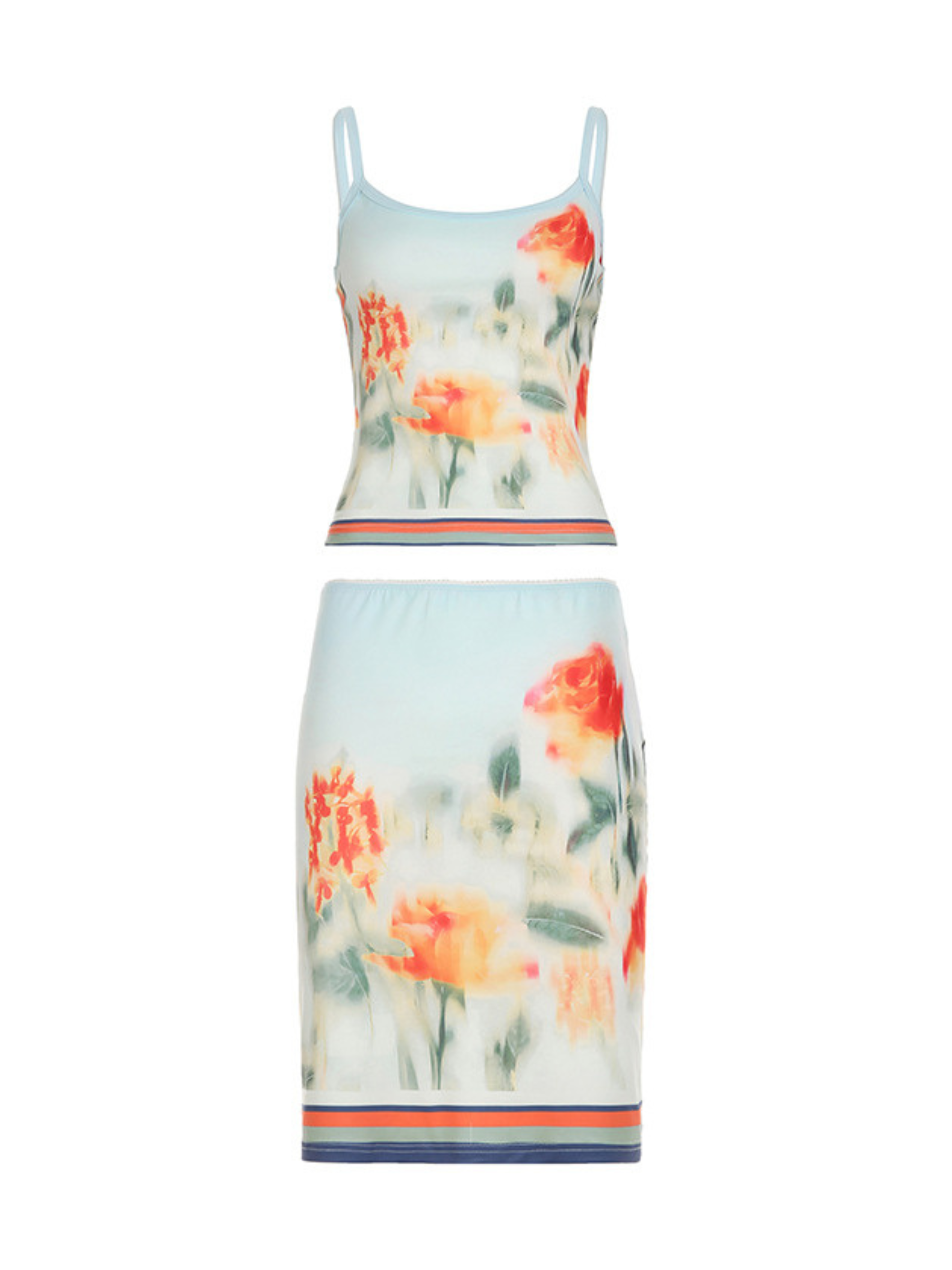 Get ready to bloom in style with the Ilyana Floral Midi Skirt Set. This two-piece set features a tank top and midi skirt with a soft sky blue base and a blurred floral print in vibrant orange. red. and green tones. Made with lightweight mesh fabric. it's both flirty and breathable. The tank top has adjustable thin straps and a bodycon silhouette. while the midi skirt has a straight fit and an elastic waistband for comfort. Perfect for any summer occasion. this set is part of the Vivuki Spring-Summer Collection.