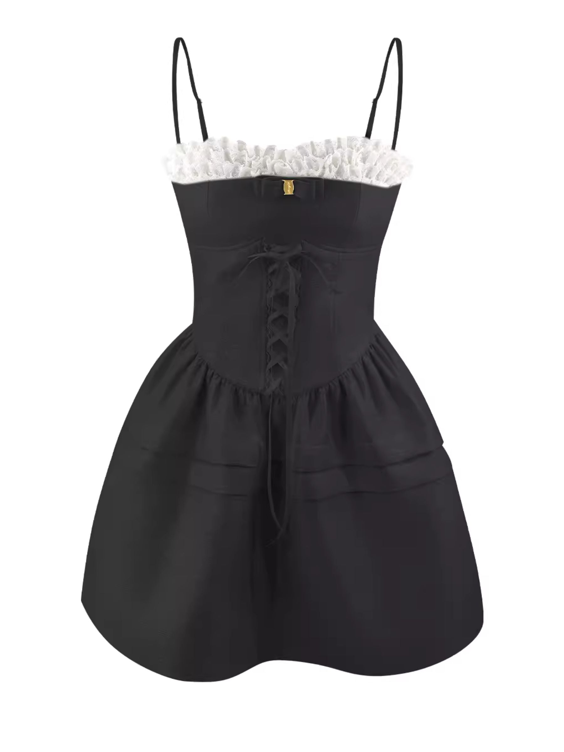 Be the picture of modern romance in the Julietta Lace Detailed Mini Dress. Lace details and a high waist A-line princess skirt make for a figure-flattering. romantic look. The bow detailed neck and spaghetti straps add a touch of sweetness. while the pleats and strappy design give it a modern edge. From Vivuki' collection of good girl gone modern styles.