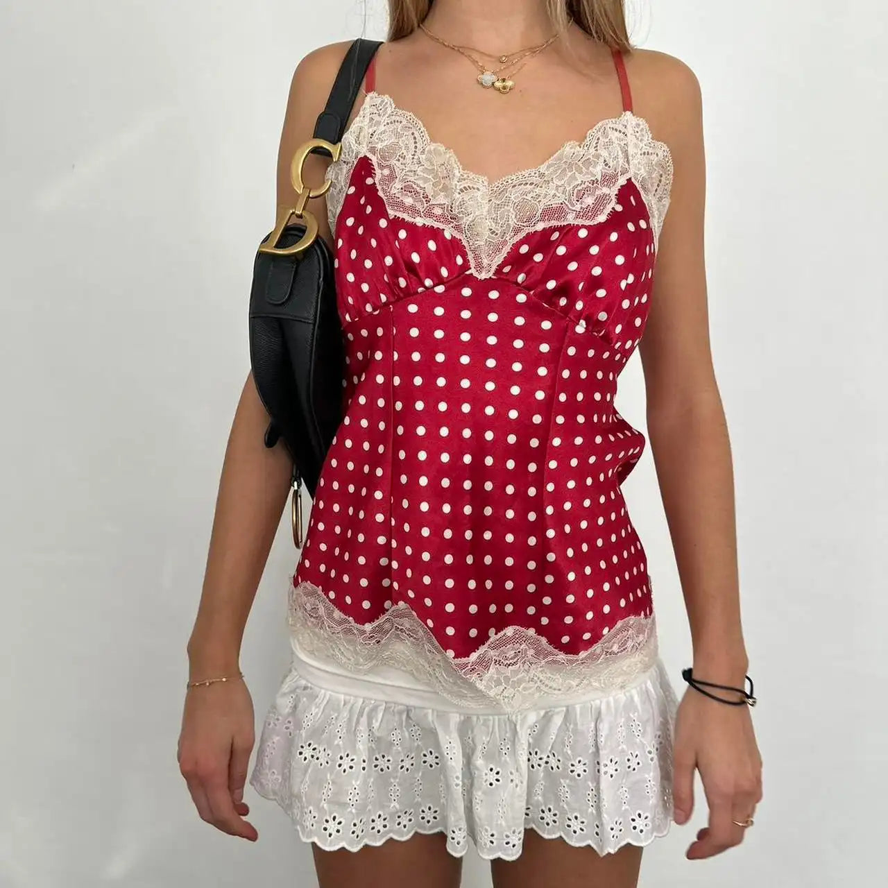 Lace Patchwork Dot Print Sleeveless Cami Tops
