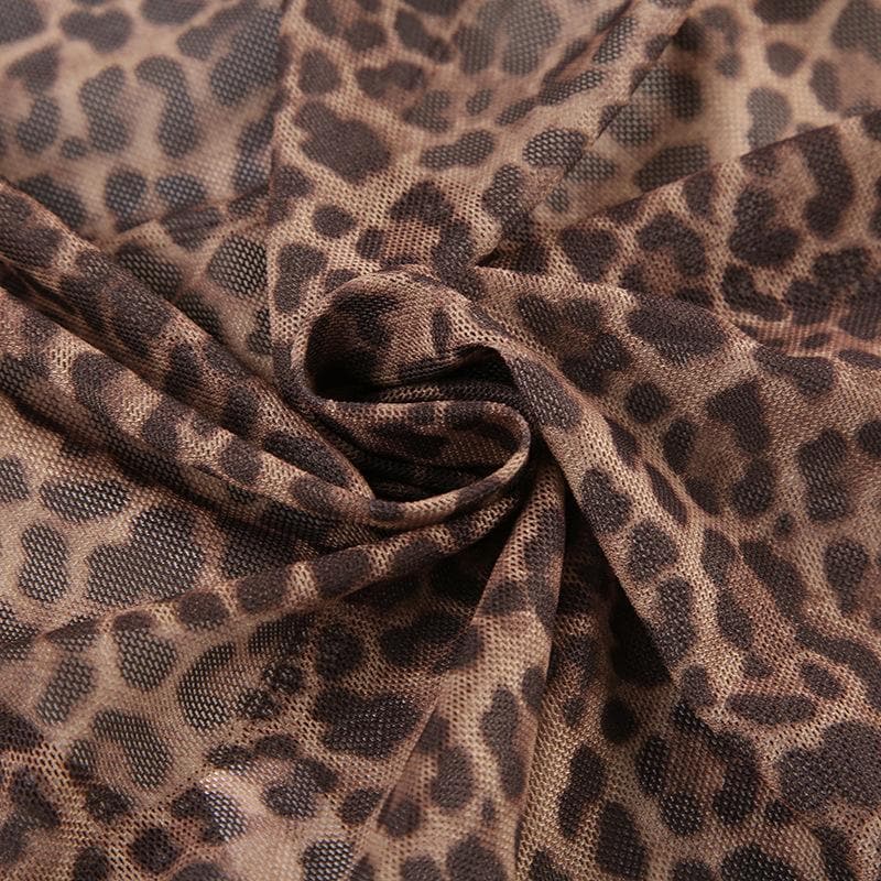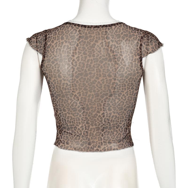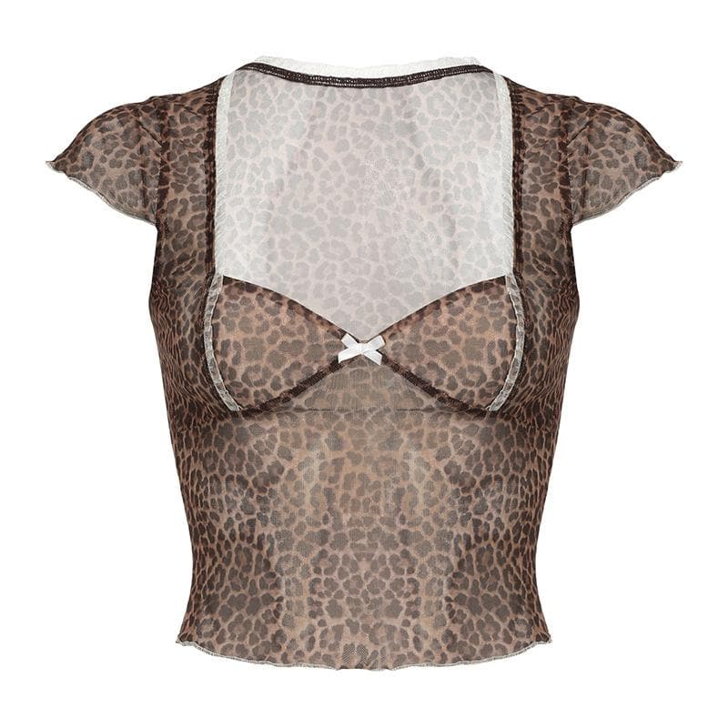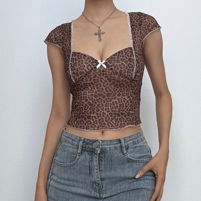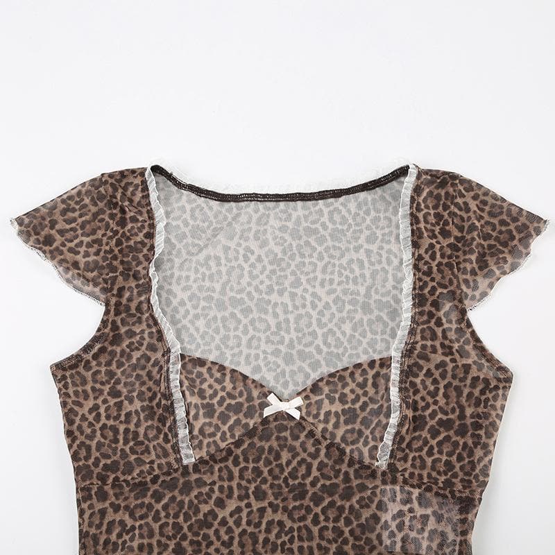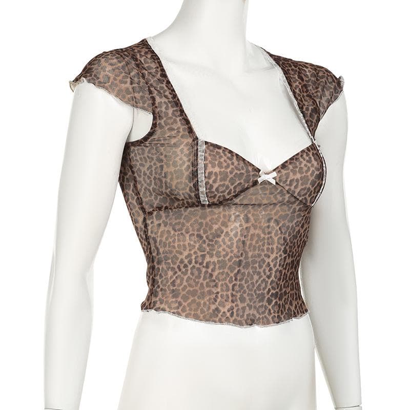 Increase quantity for Leopard print short sleeve bowknot mesh top