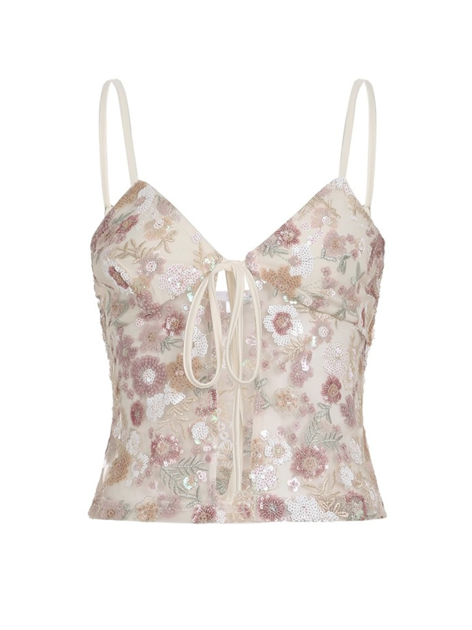 Turn heads in this dreamy floral mesh top. delicately embroidered with shimmering sequins and pastel blossoms. The lightweight sheer fabric. dainty spaghetti straps. and adjustable front tie closure create a soft. feminine silhouette that's perfect for warm days or layered evening looks. Whether paired with satin skirts or low-rise denim. this top effortlessly captures romantic. Parisian-inspired charm.