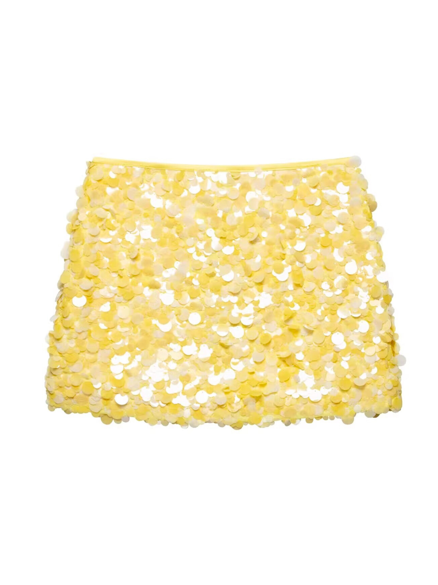 Brighten up the night with this dazzling yellow mini skirt. covered in bold oversized sequins for maximum shine. Its playful texture and vibrant hue make it the ultimate statement piece—perfect for parties. festivals. or anytime you want to steal the spotlight.