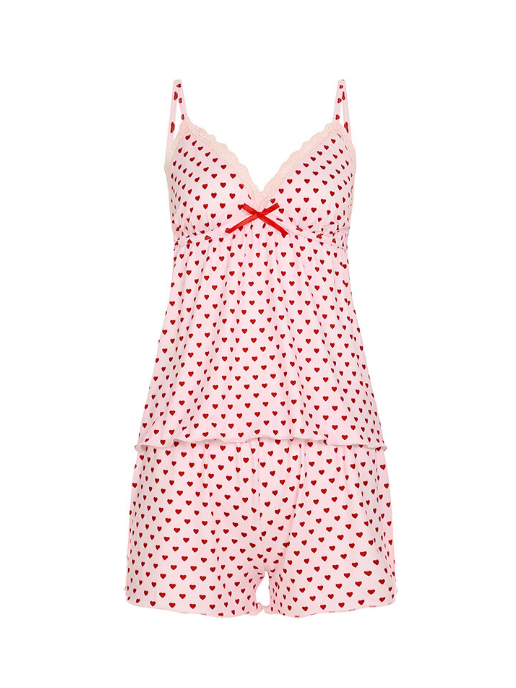 Stay cute and comfy in the Lola Pink Heart Lounge Set. Featuring an adorable allover red heart print on a soft pink base. this two-piece sleepwear set includes a flirty cami top with scalloped lace trim and a dainty red bow detail at the bust. Paired with matching shorts designed with a stretchy waistband and delicate lace trim. it's the perfect pick for lounging or bedtime in total style.