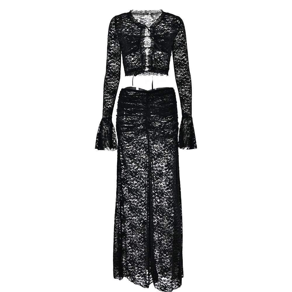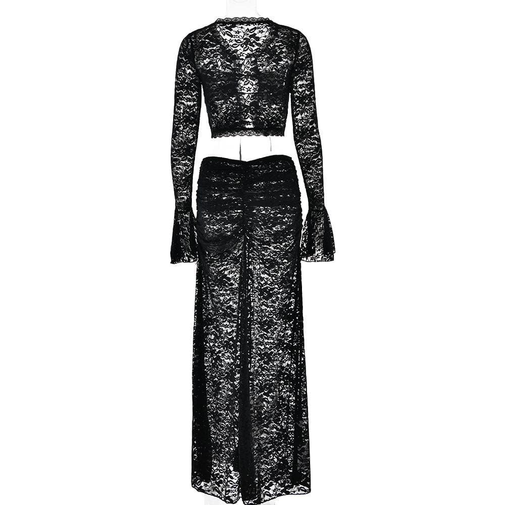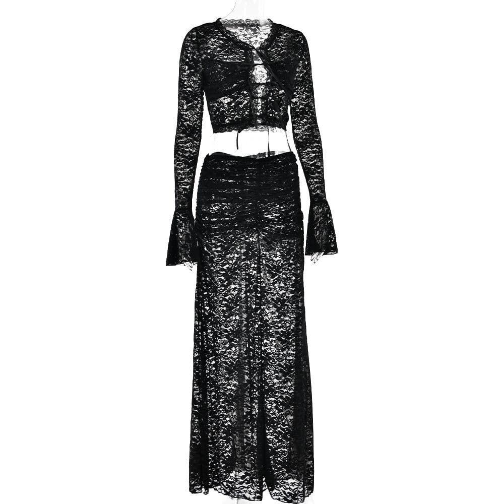Long flared sleeve lace see through maxi skirt set