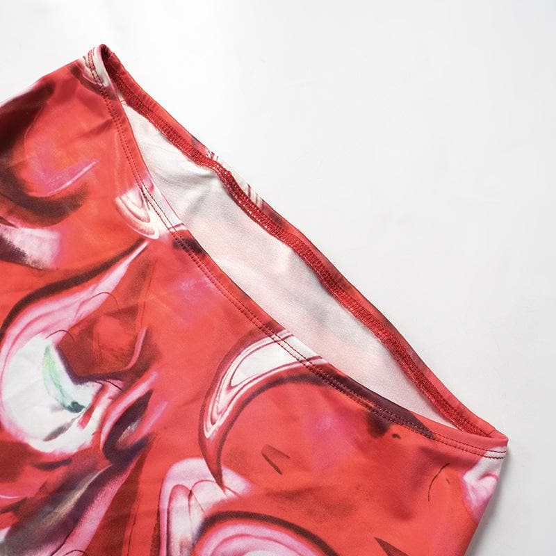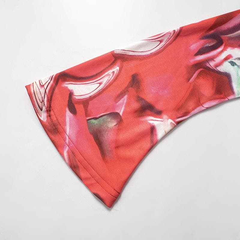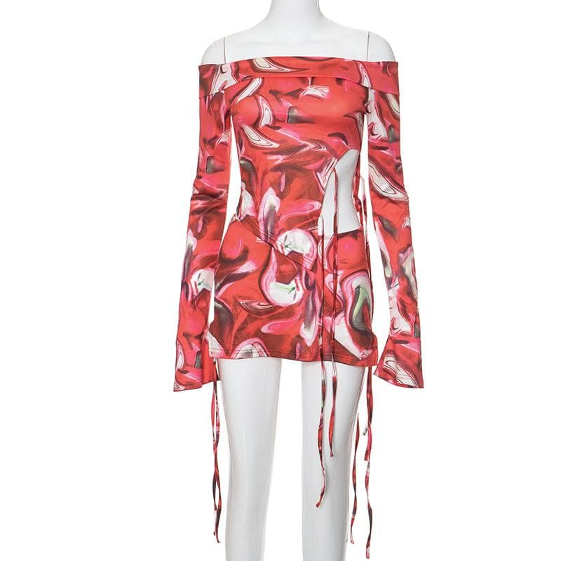 Long flared sleeve off shoulder print mini skirt set