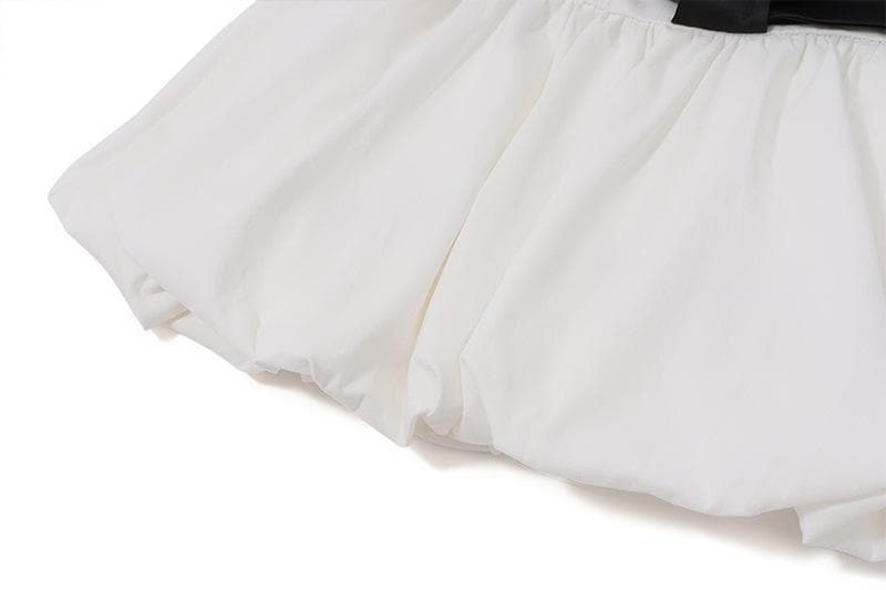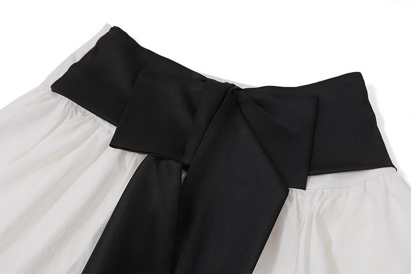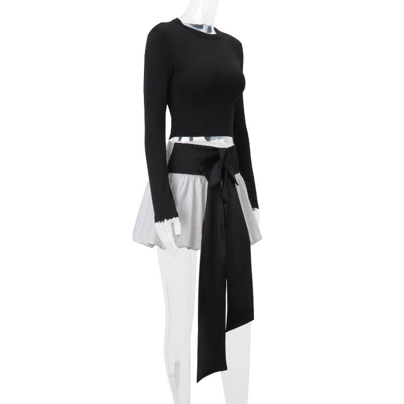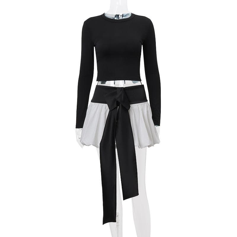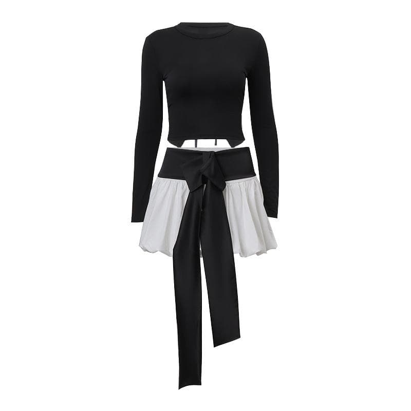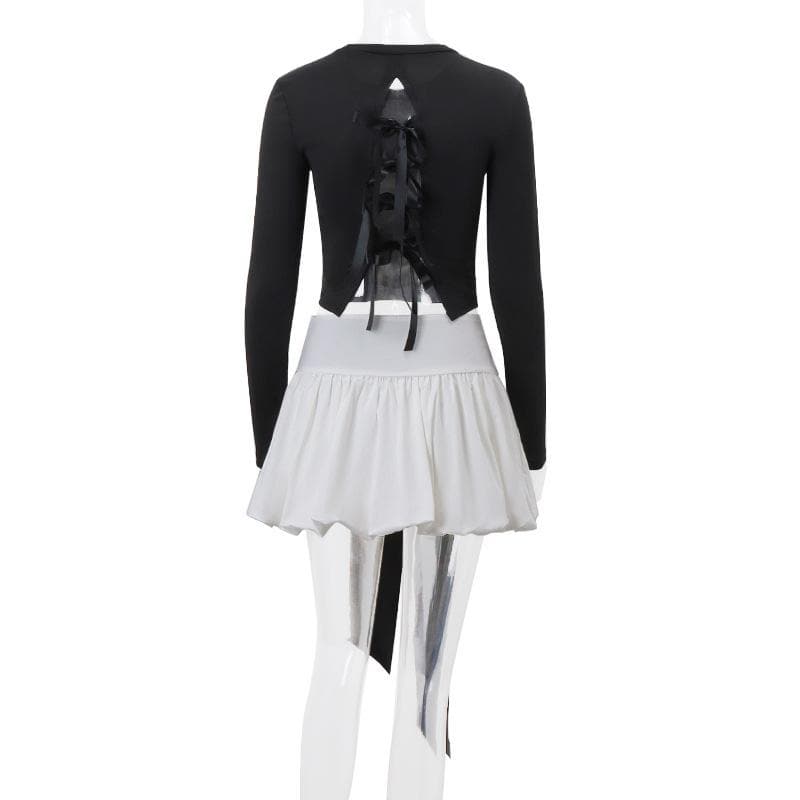 Increase quantity for Long sleeve crewneck bowknot lace up ribbon ruched mini skirt set