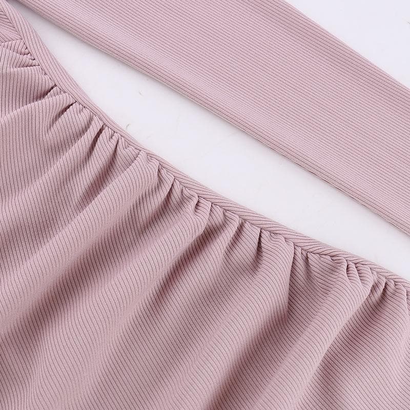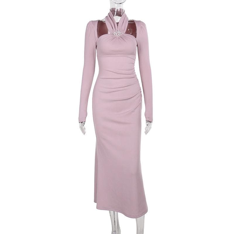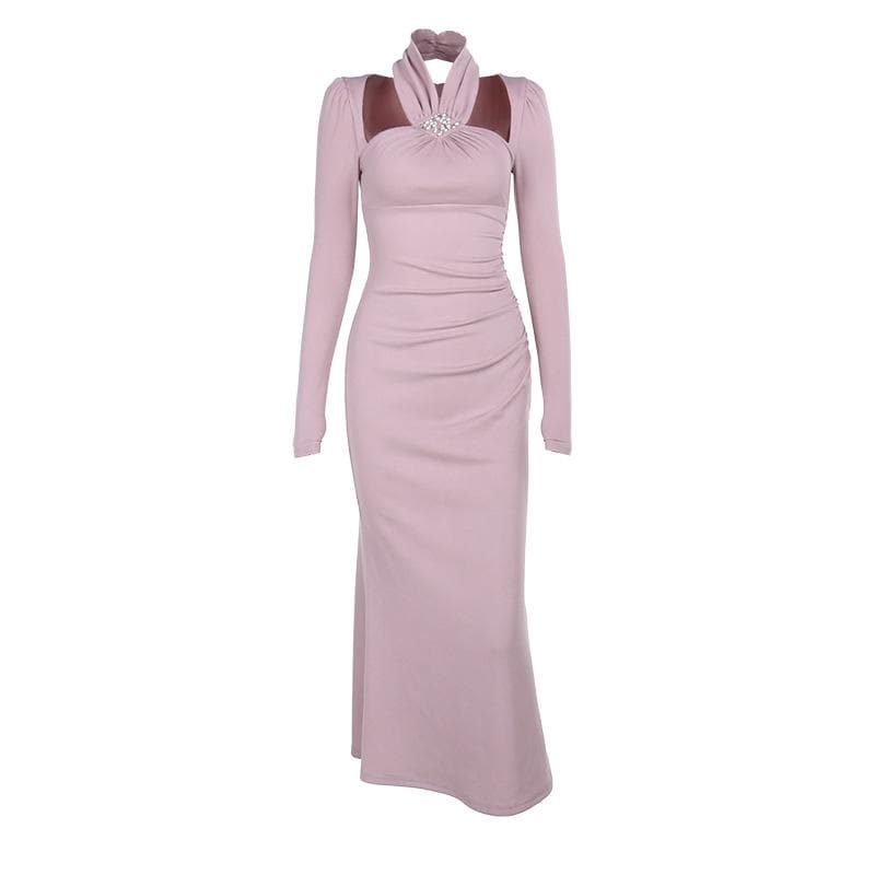 Long sleeve halter faux pearl applique ruched midi dress