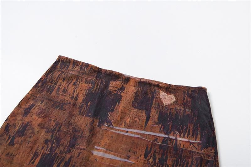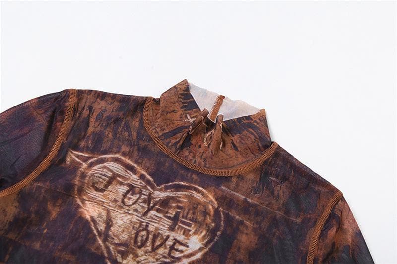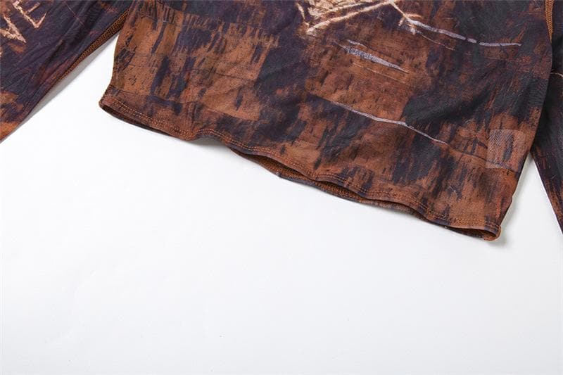 Long sleeve high neck print sheer mesh crop mini skirt set