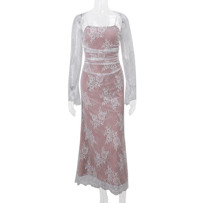 Decrease quantity for Long sleeve lace ruched shrug lace up 2 piece midi dress