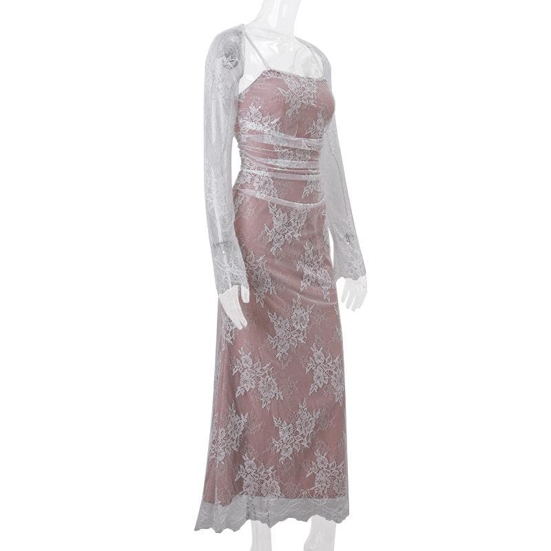 Long sleeve lace ruched shrug lace up 2 piece midi dress