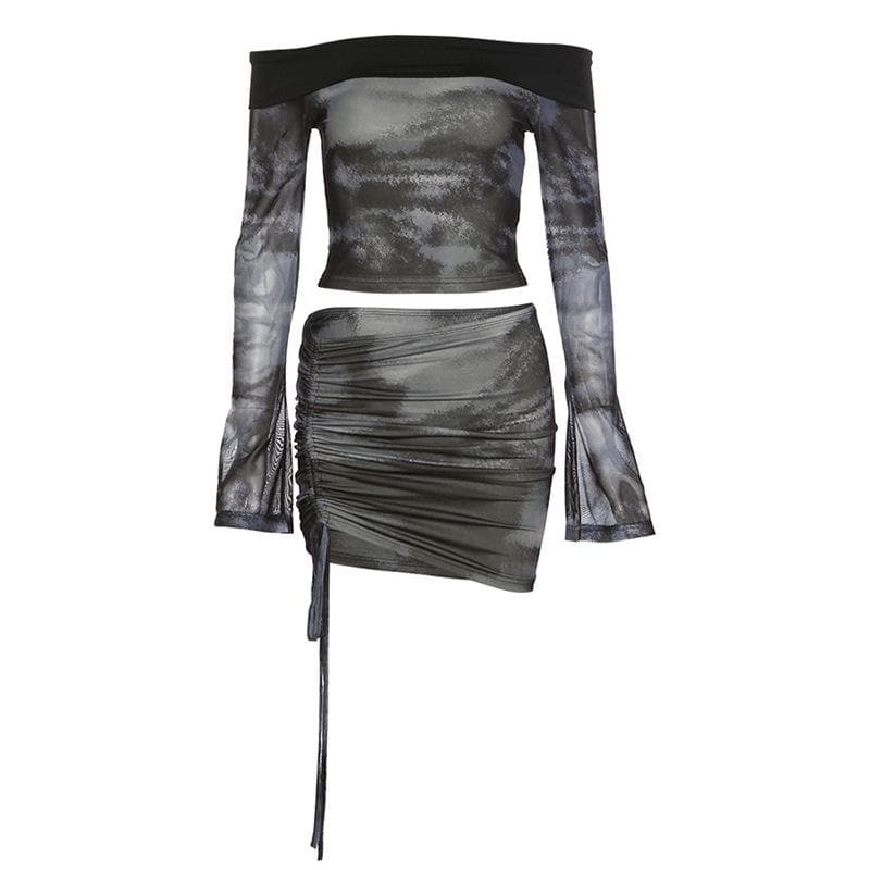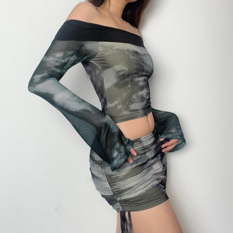 Long sleeve off shoulder contrast tie dye drawstring mini skirt set