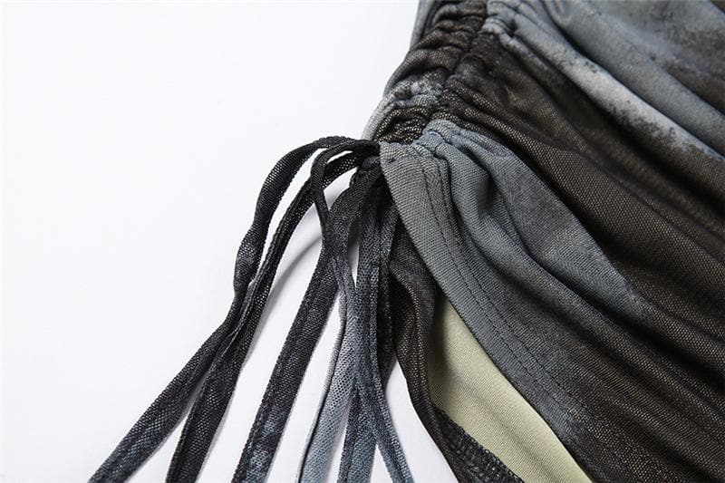 Increase quantity for Long sleeve off shoulder contrast tie dye drawstring mini skirt set