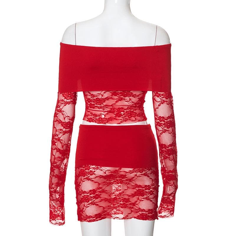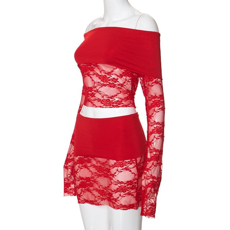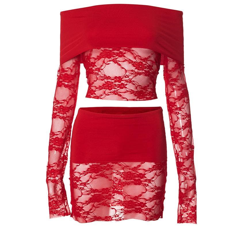 Decrease quantity for Long sleeve off shoulder lace see through mini skirt set