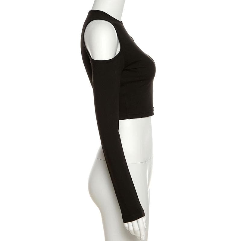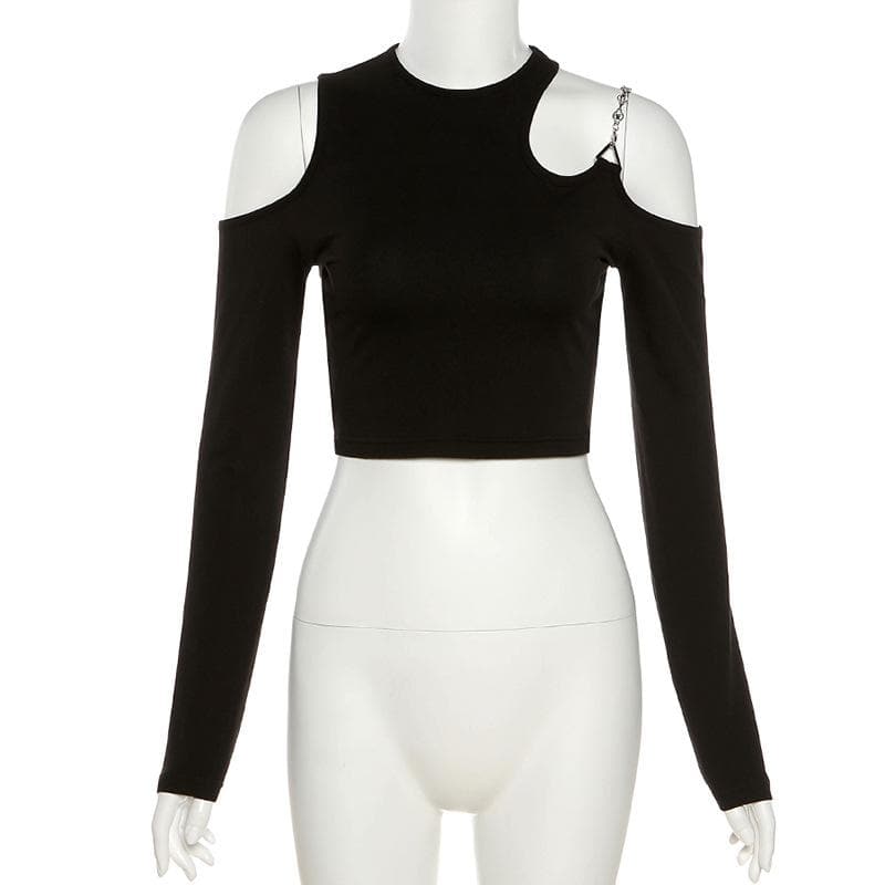 Long sleeve off shoulder metal chain crewneck solid crop top