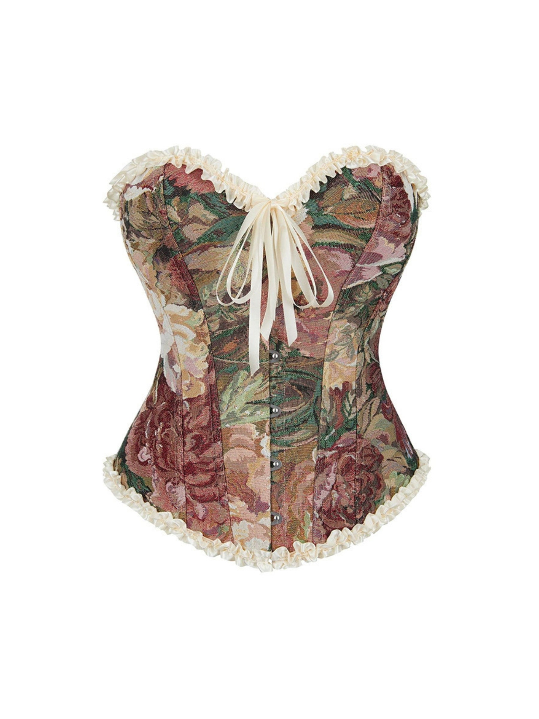 These tapestry corsets channel vintage elegance with a romantic twist. The rich floral upholstery fabric. structured boning. and satin ribbon detailing create a refined silhouette that recalls antique charm while offering a flattering. modern fit. Whether paired with a flowing skirt or tailored trousers. these corsets are timeless statement pieces that elevate any outfit.