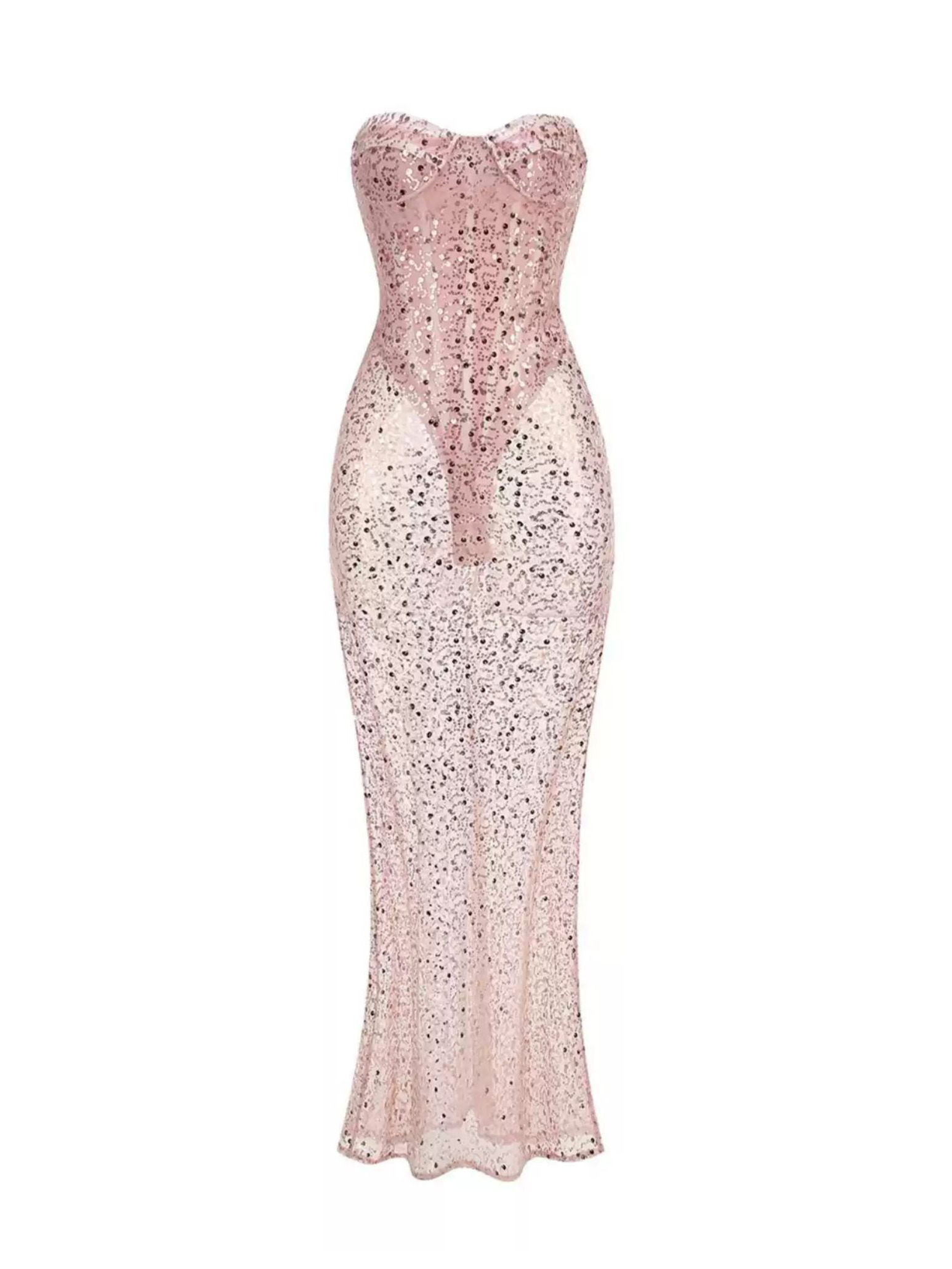 Shine bright with this stunning Loxley Sequin Corset Dress in Light Pink. perfect for glamorous evenings or special occasions. The dress features an intricate sequin design that glimmers with every move. while the structured corset bodice enhances your figure. Its strapless design and body-hugging silhouette make this piece a showstopper.