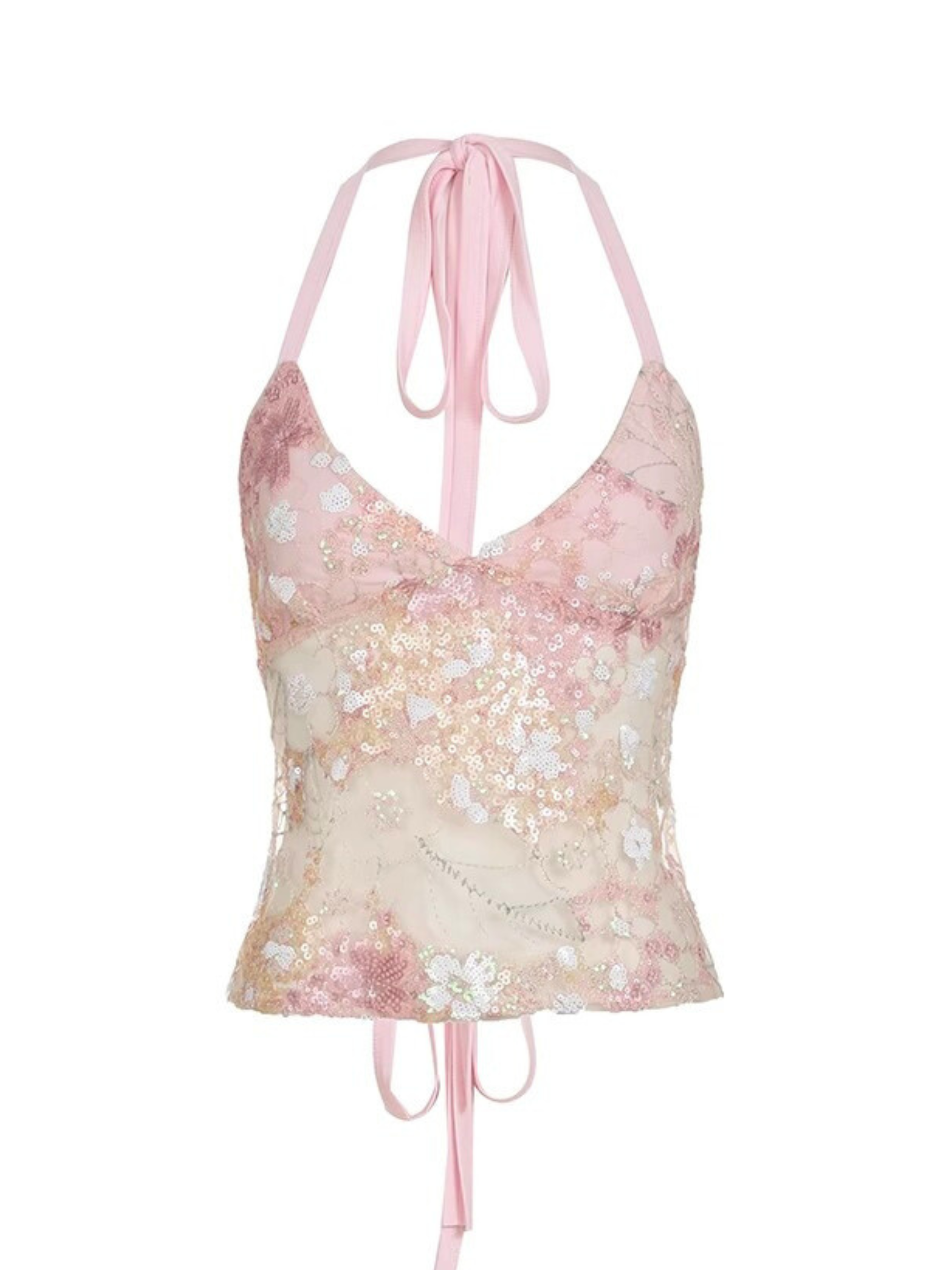 A romantic dream spun from sequins and sheer lace �this halter top is designed for sun-kissed days and candlelit nights. With its delicate floral embroidery. soft pink shimmer. and fully open back with tie closures. it radiates soft girl energy with a flirty. nostalgic twist. Whether layered over denim or worn solo for a night out. it's your go-to piece when you want to sparkle effortlessly.