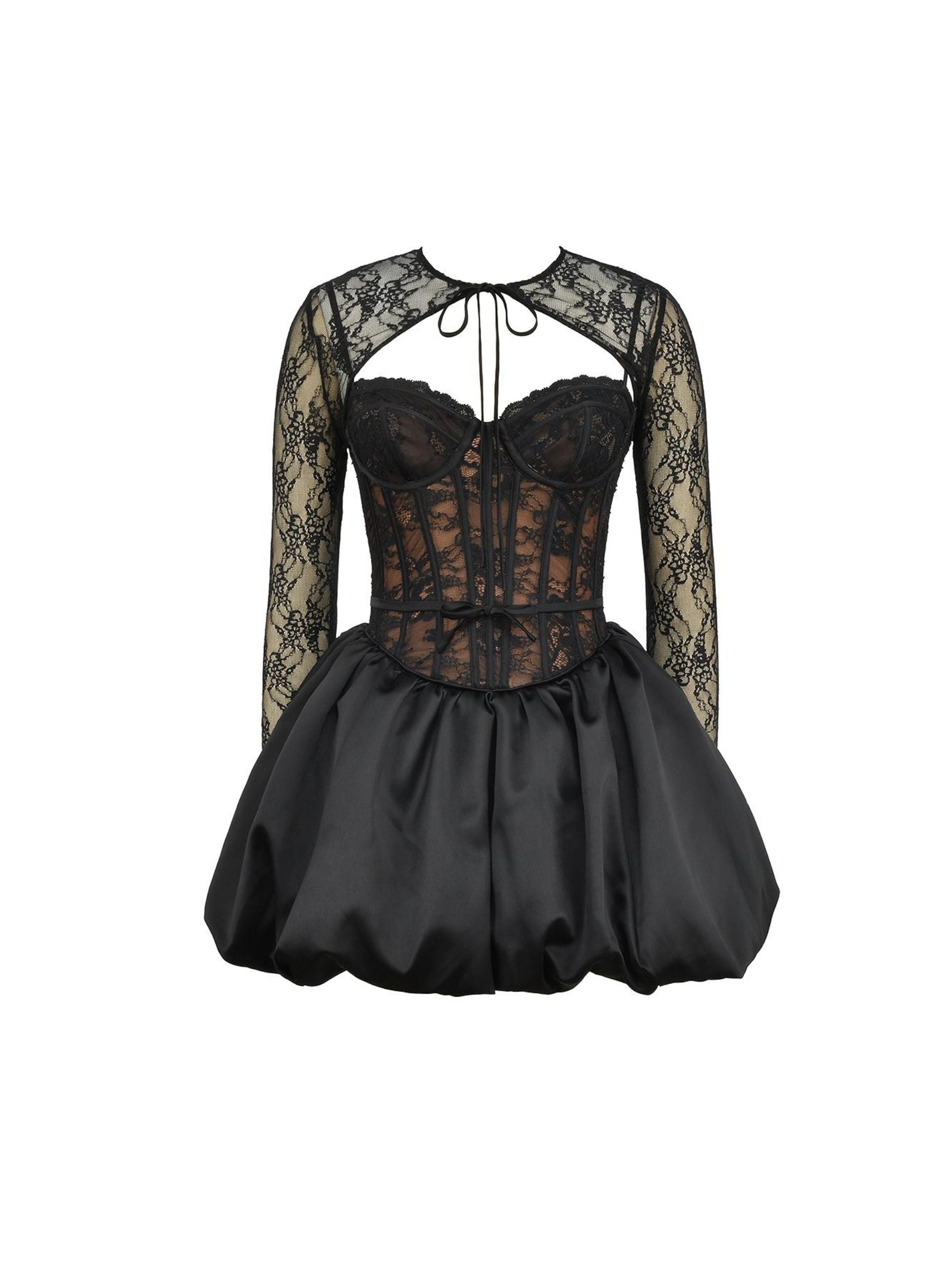 Turn heads with the Navie Lace Corset Balloon Dress. a stunning fusion of elegance and boldness. This black dress features intricate lace detailing and a structured corset bodice for a captivating silhouette. while the voluminous balloon skirt adds a dramatic flair.