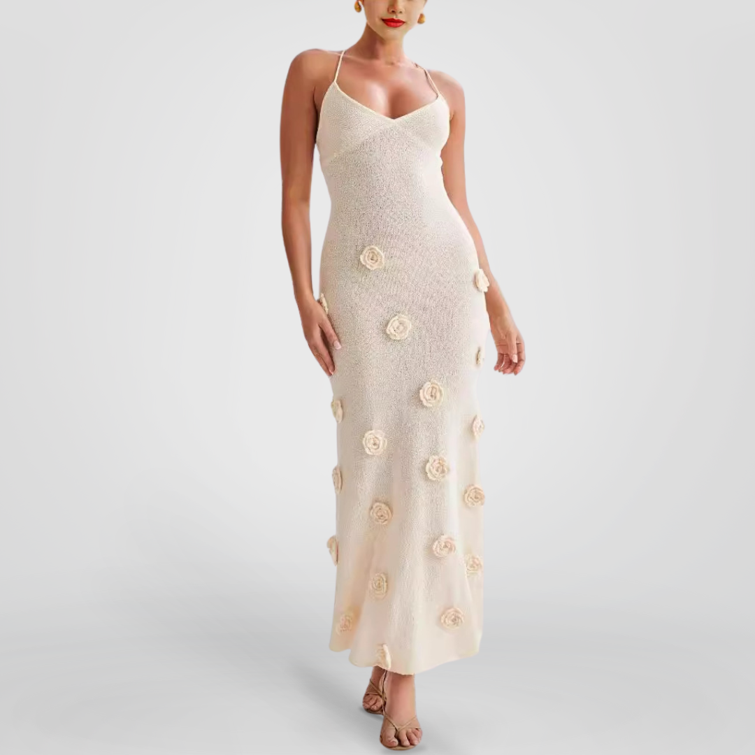 This crochet dress is a playful number that is perfect to wear to an event or occasion. This dress features a string design and an adjustable neckline and an open back. offering a relaxed and flattering fit while the delicate flower appliques add a romantic touch.