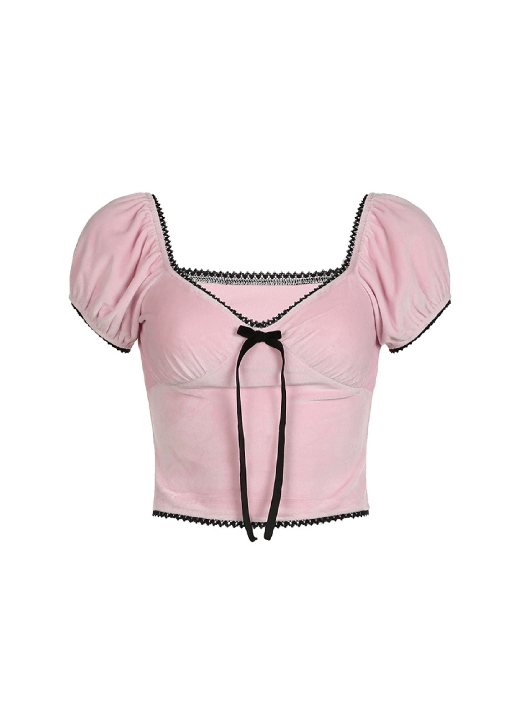 This delicate and stylish top adds a romantic touch to your wardrobe with its soft pink hue and charming black lace accents. Featuring a flattering V-neckline. puff sleeves. and a cute bow detail at the center. the Lora Lace V-Neck Bow Top is perfect for casual outings. date nights. or a chic everyday look.