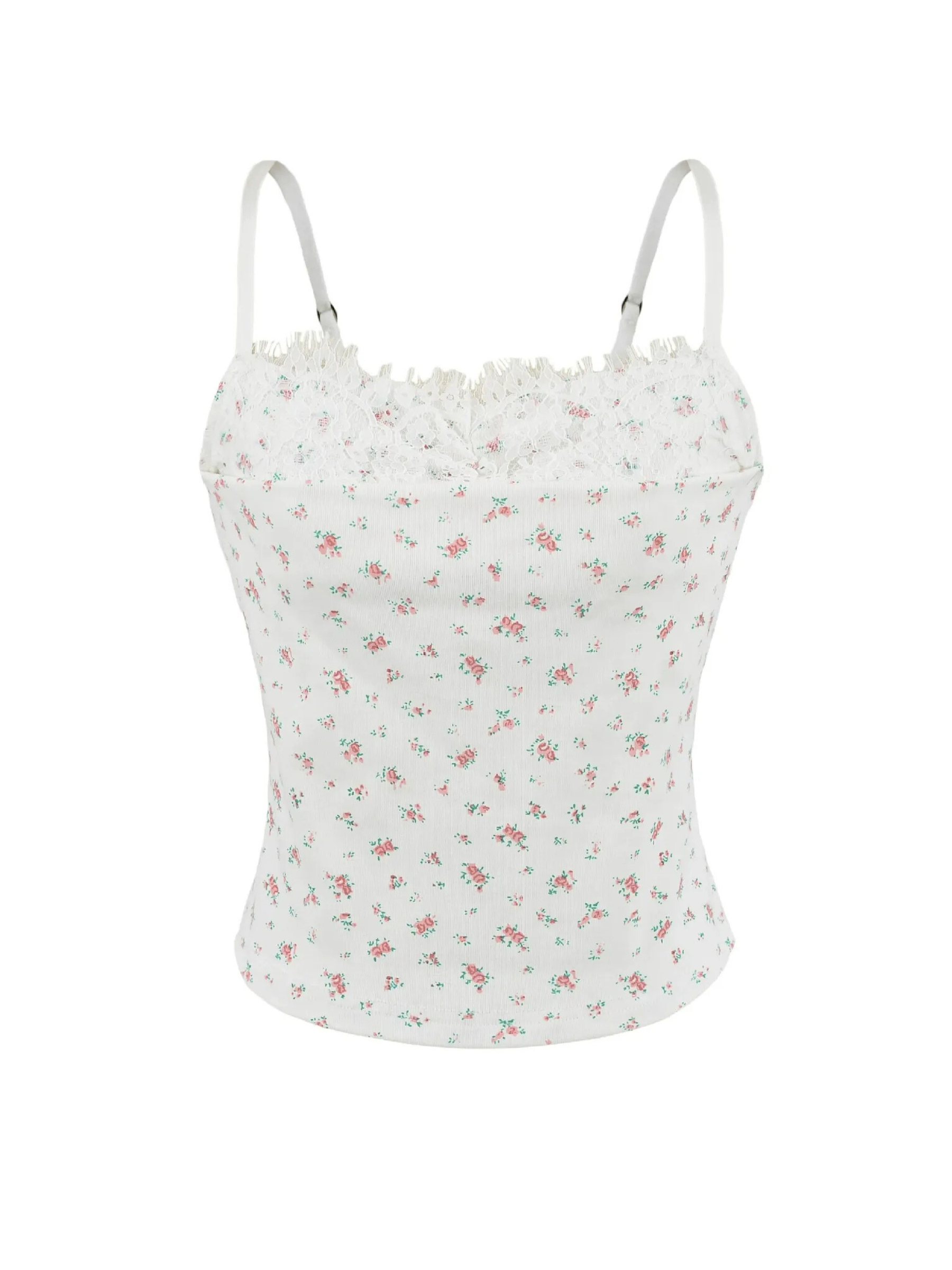 Elevate your basics with this soft floral camisole. delicately adorned with lace trim and a flattering silhouette. Featuring adjustable spaghetti straps and a lightly stretchy ribbed fabric. this top combines comfort with romantic charm. Whether layered under a cardigan or worn solo. it adds a soft feminine touch to any outfit.
