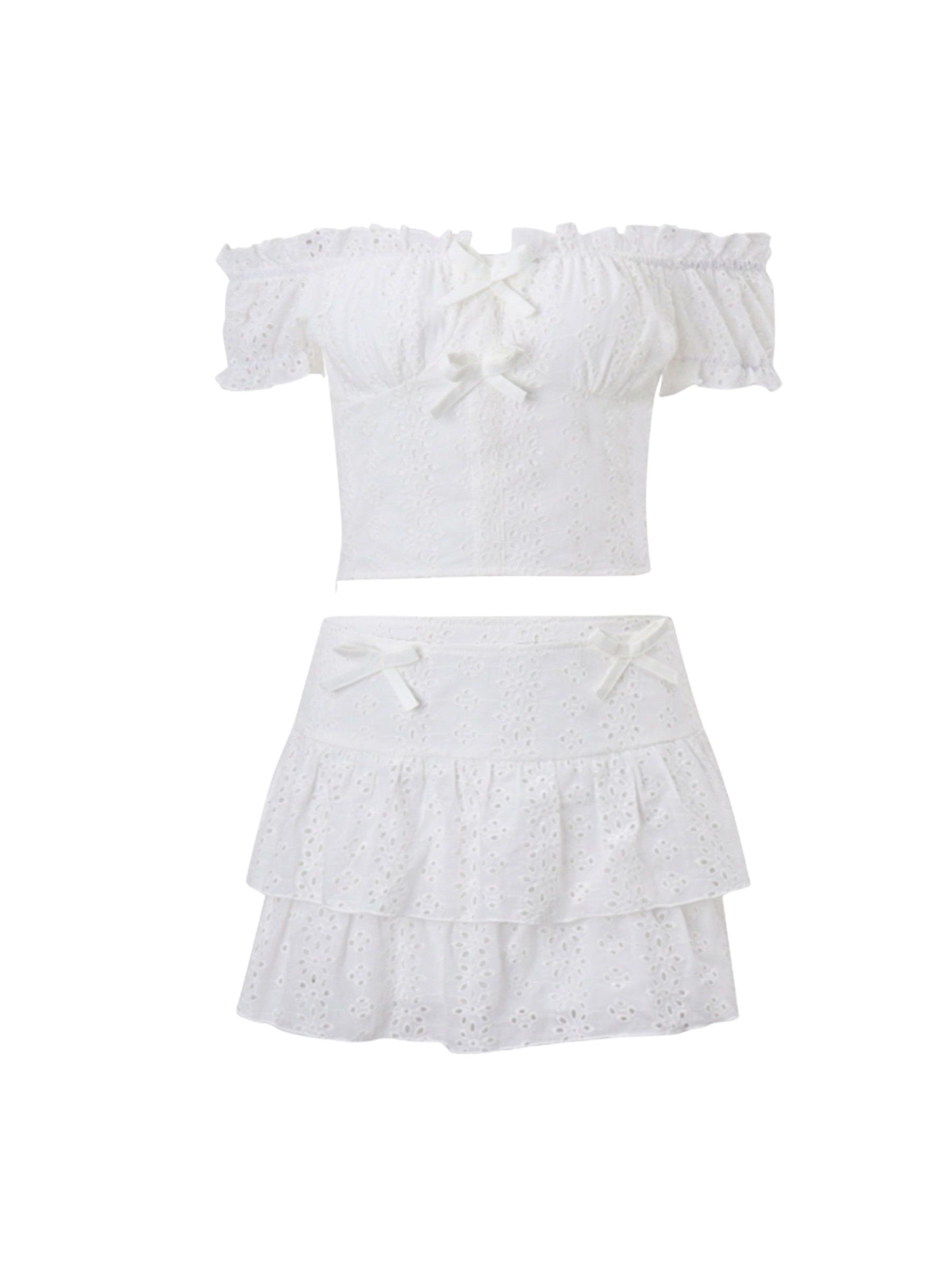 Stay flirty and fresh in the Nura Ruffle Skirt Set. Designed to turn heads. this dreamy white two-piece features delicate broderie anglaise fabric. charming ruffle detailing. and feminine bow accents. The off-shoulder crop top hugs the body with a flattering ruched design. while the layered mini skirt adds a playful bounce to every step. Whether you're headed to a summer picnic. a romantic date. or a festival day out. Liliana keeps your look effortlessly sweet and sexy.