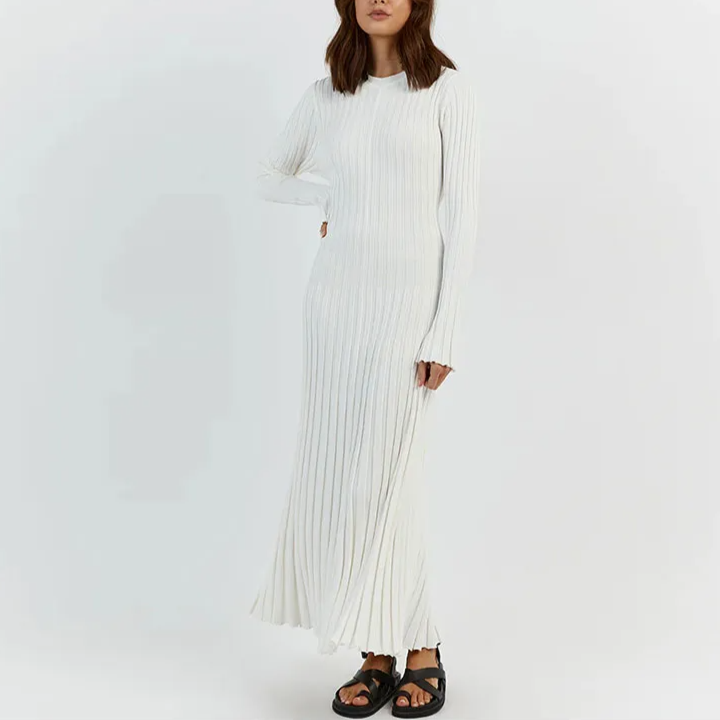 Designed for elegant comfort. this timeless minimalistic dress Knit Dress features a relaxed fit and a round neckline. Made in a wide rib technique. this Knit Dress cascades along the body for comfort and ease of movement. A minimalistic staple.