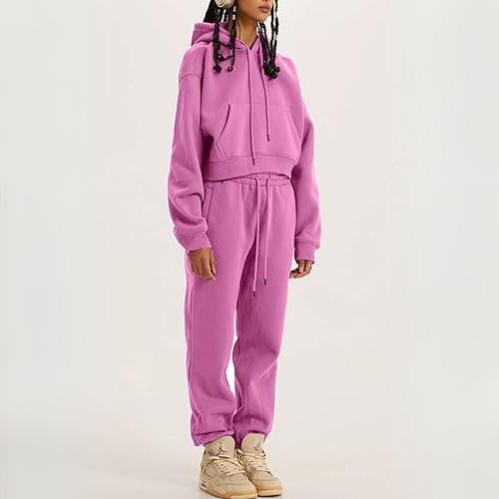 This is the perfect casual two-piece athletic workout set. elastic waist with drawstring. stretchy leg opening. the same fleece as the top. long pants with side pockets. loose fit women's joggers set for women. what's not to love?