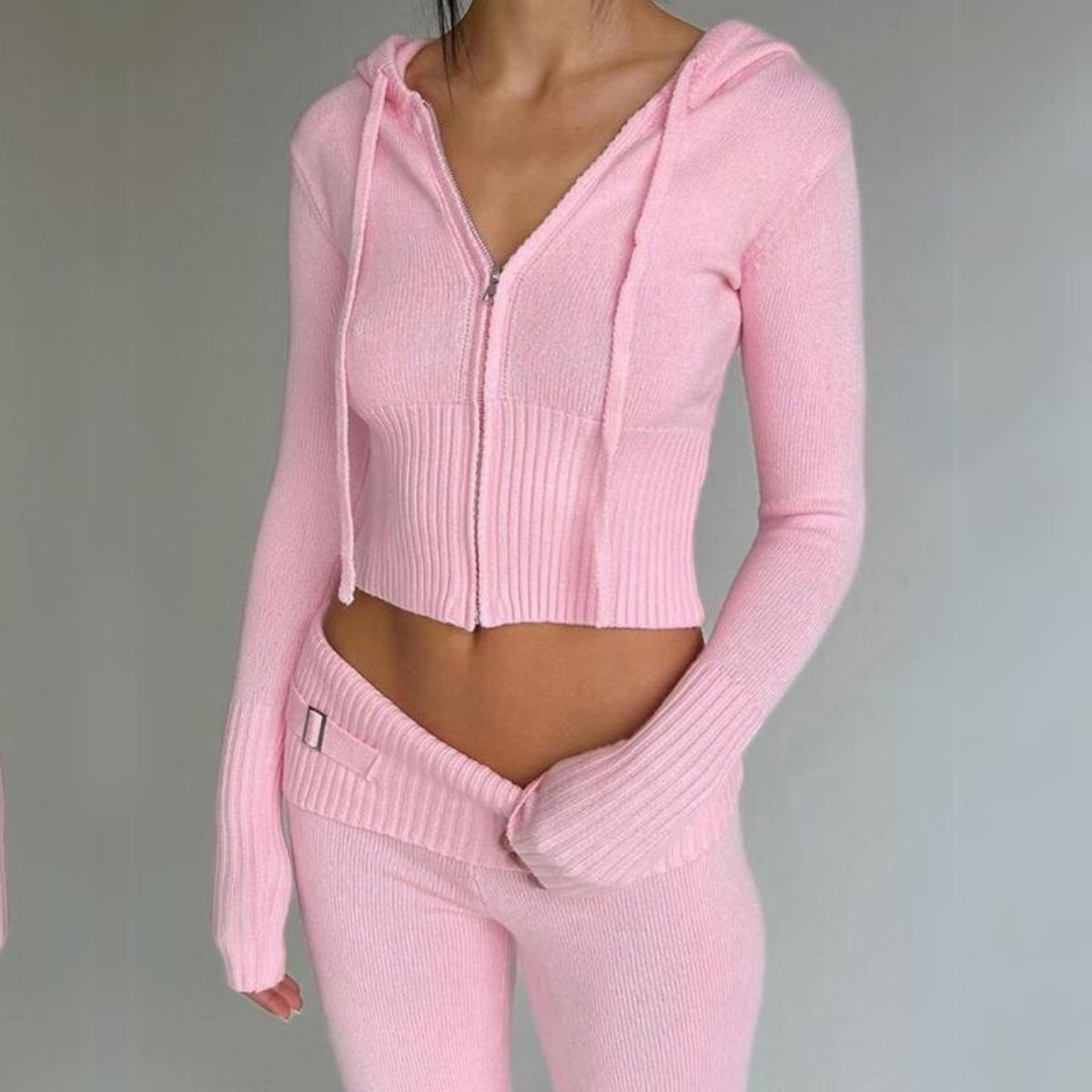 Step into the fall season with this cozy 2-piece fall staple. Introducing our comfortable and stylish two-piece knitted sweatsuit set design specifically to ensure comfort and style.This stunning set includes a zip-up crop top hoodie and a pair of elastic waist pants. making it the perfect ensemble for a relaxed yet trendy look.
