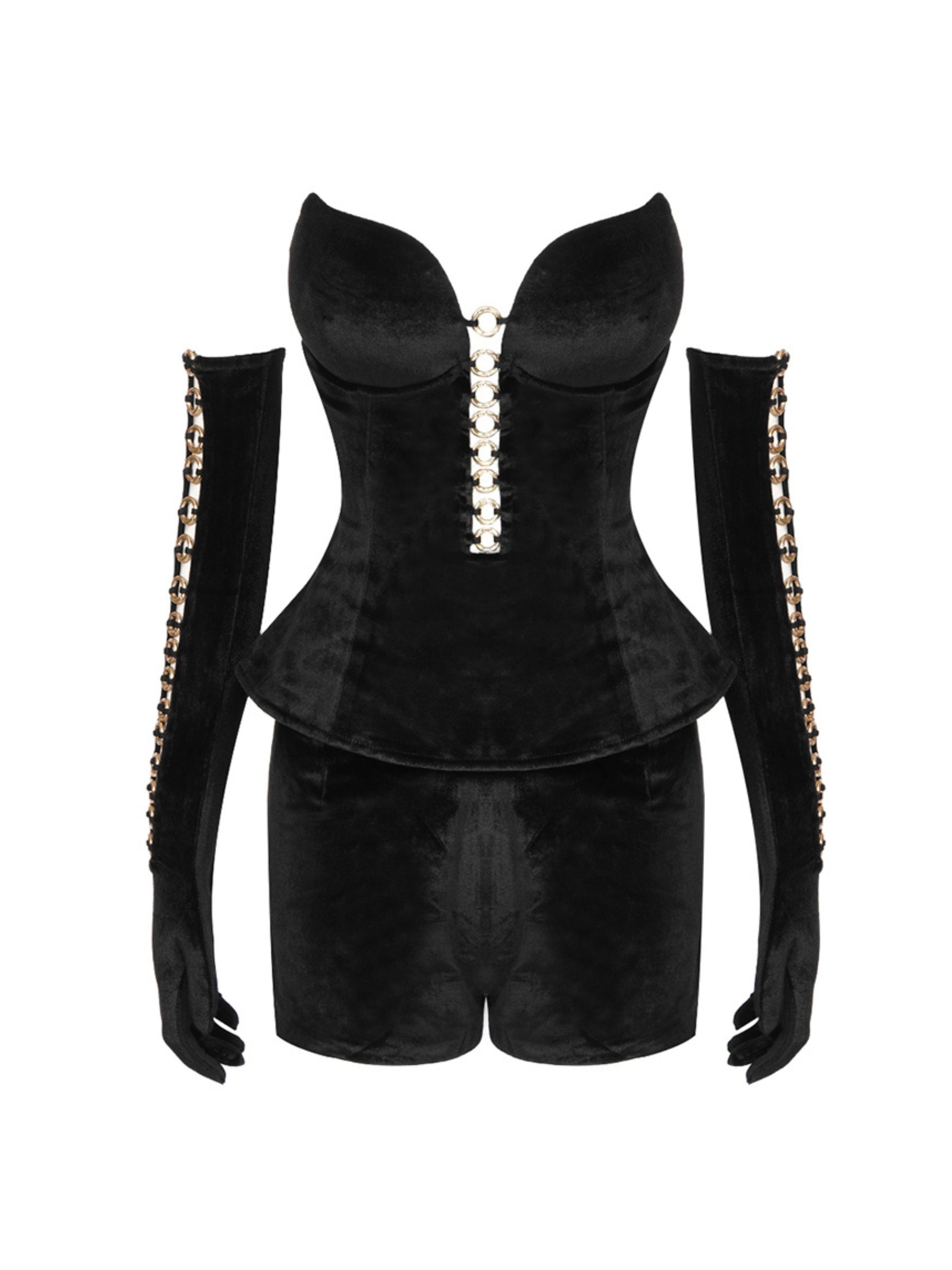 Indulge in the Raizel Velvet Shorts Set featuring a corset top. high waist shorts. and long gloves for a complete 4 piece outfit. This set from the Vivuki Matching Sets Collection is both sexy and elegant. with a slim fit that flatters your figure.