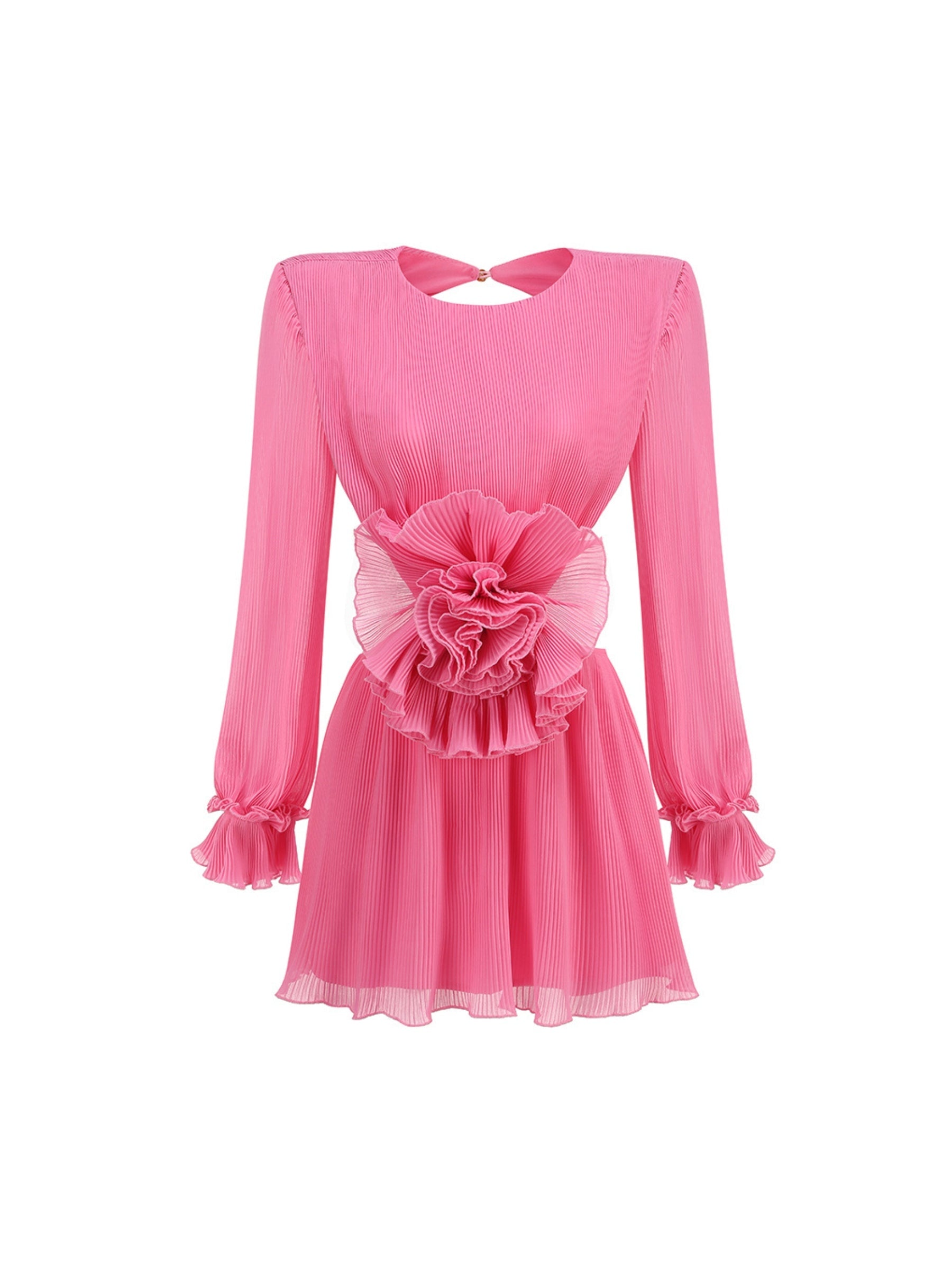 Step into the spotlight with the Raya Backless Floral Mini Dress in Pink. a perfect blend of elegance and charm. This enchanting dress features a sophisticated round neck and long sleeves. offering a balanced mix of coverage and style. The soft. striped fabric adds a subtle texture that enhances the dress's delicate appeal. Designed with an A-line mini skirt. the Raya dress creates a flattering silhouette that's both feminine and playful. The elastic waist ensures a comfortable fit. while the solid pink hue brings a fresh and versatile look. ideal for any occasion. Whether it's a special event or a night out. the Raya Backless Floral Mini Dress from the Vivuki Evening Dresses Collection is your go-to choice for effortless style and grace.