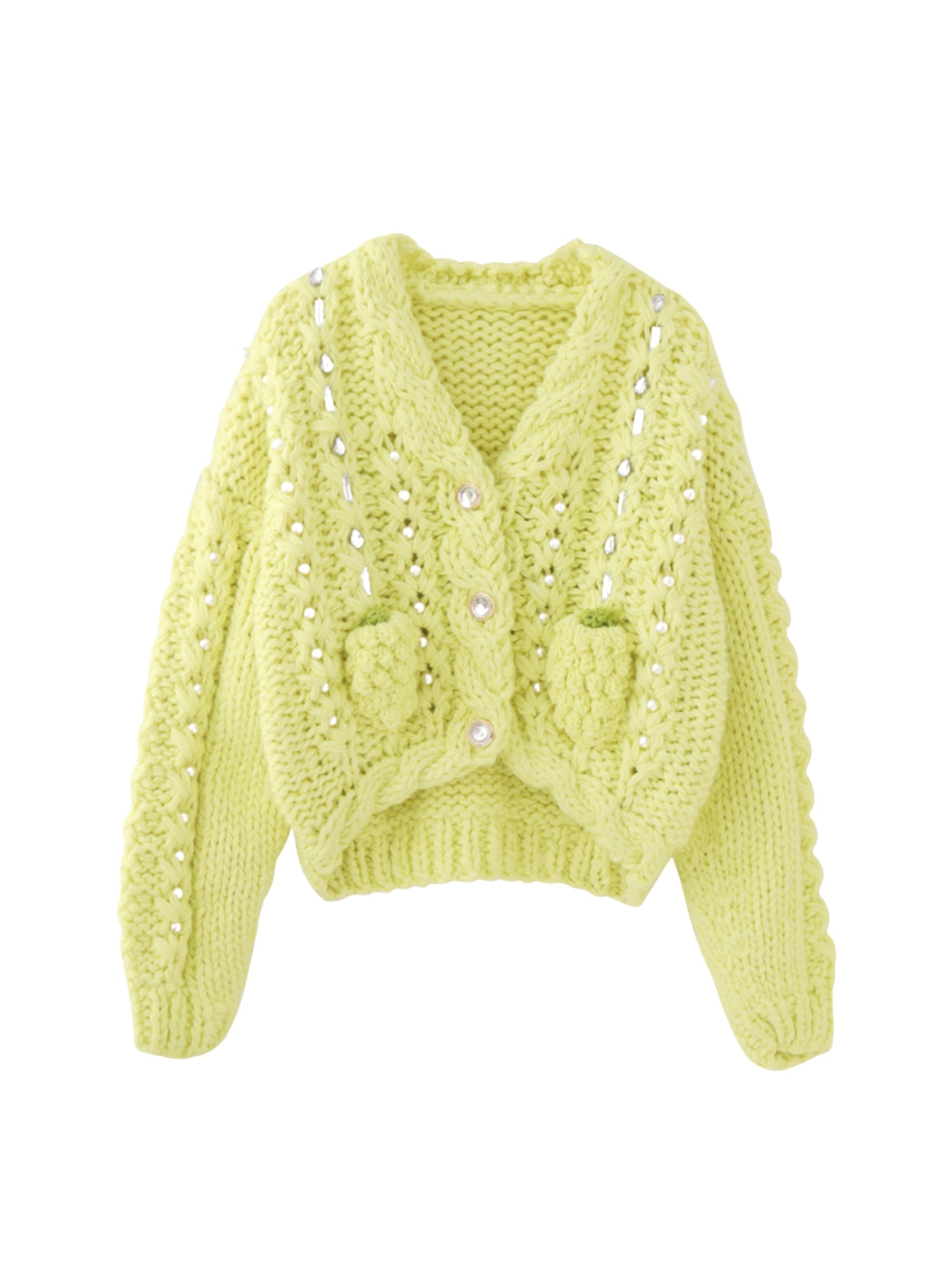 Get cozy with the Rosario Knitted Cardigan from Vivuki Winter Collection. Handmade with chunky knit texture and a cable-knit design. this lime cardigan features pearl embellishments for a touch of chic. With front pockets and a button-up closure. it's perfect for layering during the fall and winter. (Pearls not just for grandma's jewelry!)