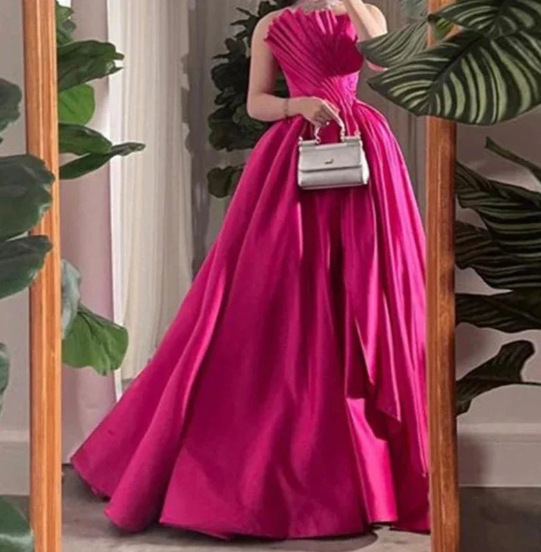Rose Pink Silk Strapless A-line Sleeveless Prom Dress Details:
