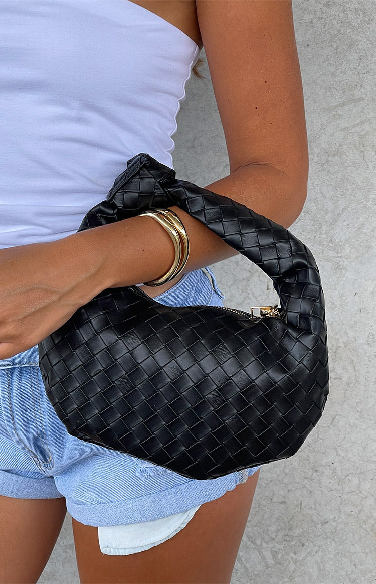 Refresh your accessories with the Rylie Black PU Bag! The woven leather material and gold hardware adds an elegant touch to any outfit! Whether you're grabbing coffee or heading out for drinks with the girls. this bag has got you covered!