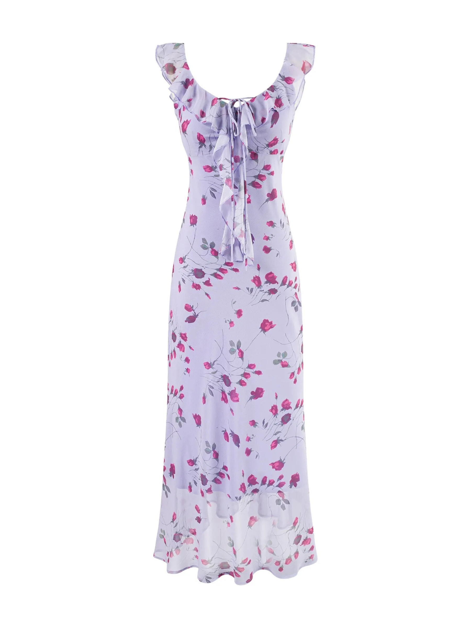 Delicate and dreamy. this floral maxi dress is your go-to piece for sun-drenched afternoons and garden soirées. Featuring a soft ruffled neckline. adjustable tie-front detail. and a flowing silhouette. this dress brings elegance and movement with every step. The sheer outer layer over a soft lining enhances its lightweight and breezy feel â€?available in charming lilac and warm yellow floral prints.