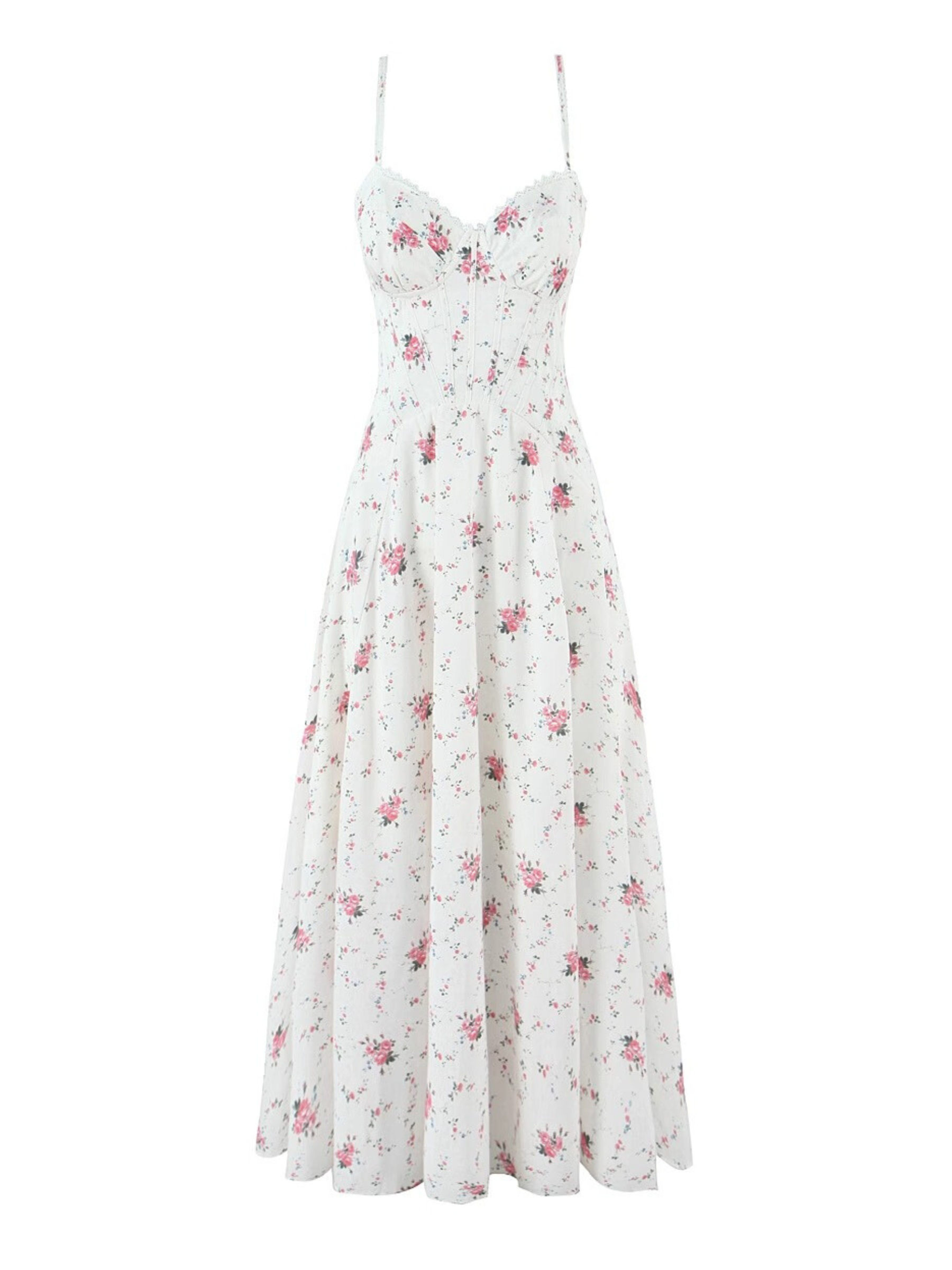 Romantic and effortlessly graceful. this vintage-inspired floral dress captures the spirit of a sun-drenched countryside escape. The sweetheart neckline and corset-style lace-up back create a flattering silhouette. while delicate pink blooms dance across the soft white fabric. Ideal for picnics. garden parties. or dreamy afternoons. it's a timeless piece that brings out your feminine charm with a touch of nostalgia.