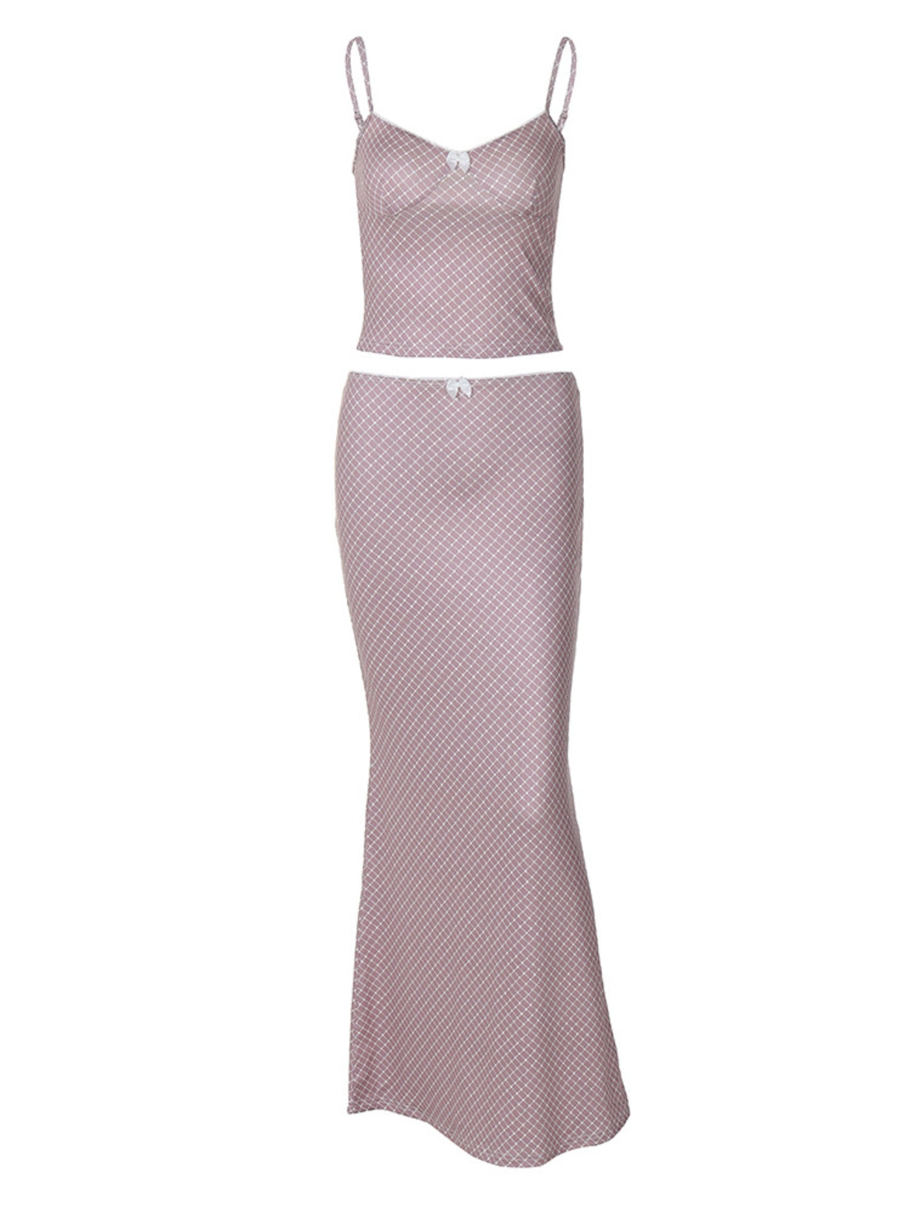 Get ready to stun in the Shia Two Piece Skirt Set! This matching outfit set includes a khaki. sleeveless v-neck camisole top and a high waist maxi skirt. With a mini bow detail and part of the Vivuki Spring-Summer Collection. this set is perfect for those who want to stay on-trend and look stylish effortlessly.