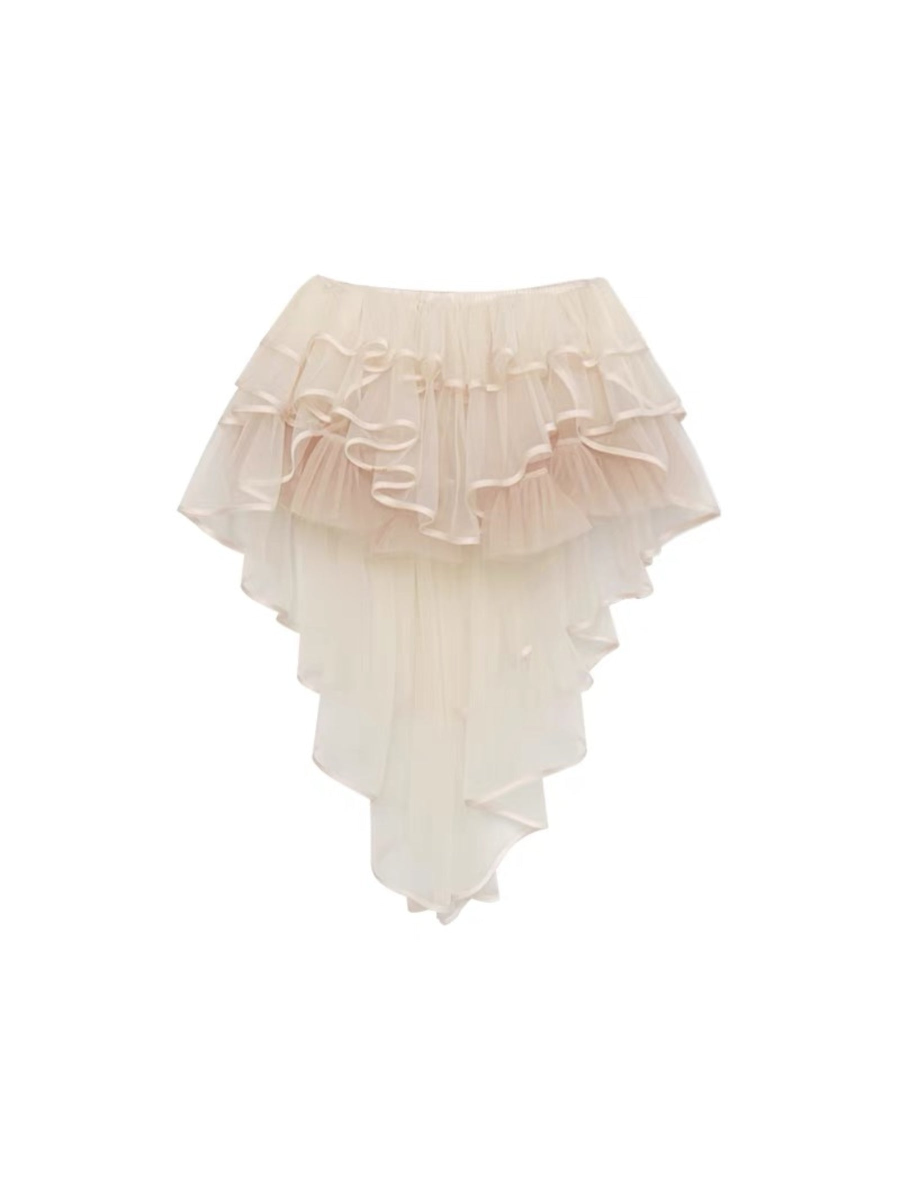 Indulge in some good girl vibes with our Sofi Asymmetric Ruffle Skirt. This multi-layered skirt features an eye-catching asymmetrical design in a soft nude color. Fit for a princess. this skirt is perfect for adding a touch of fairycore to your wardrobe. From our Vivuki collection.