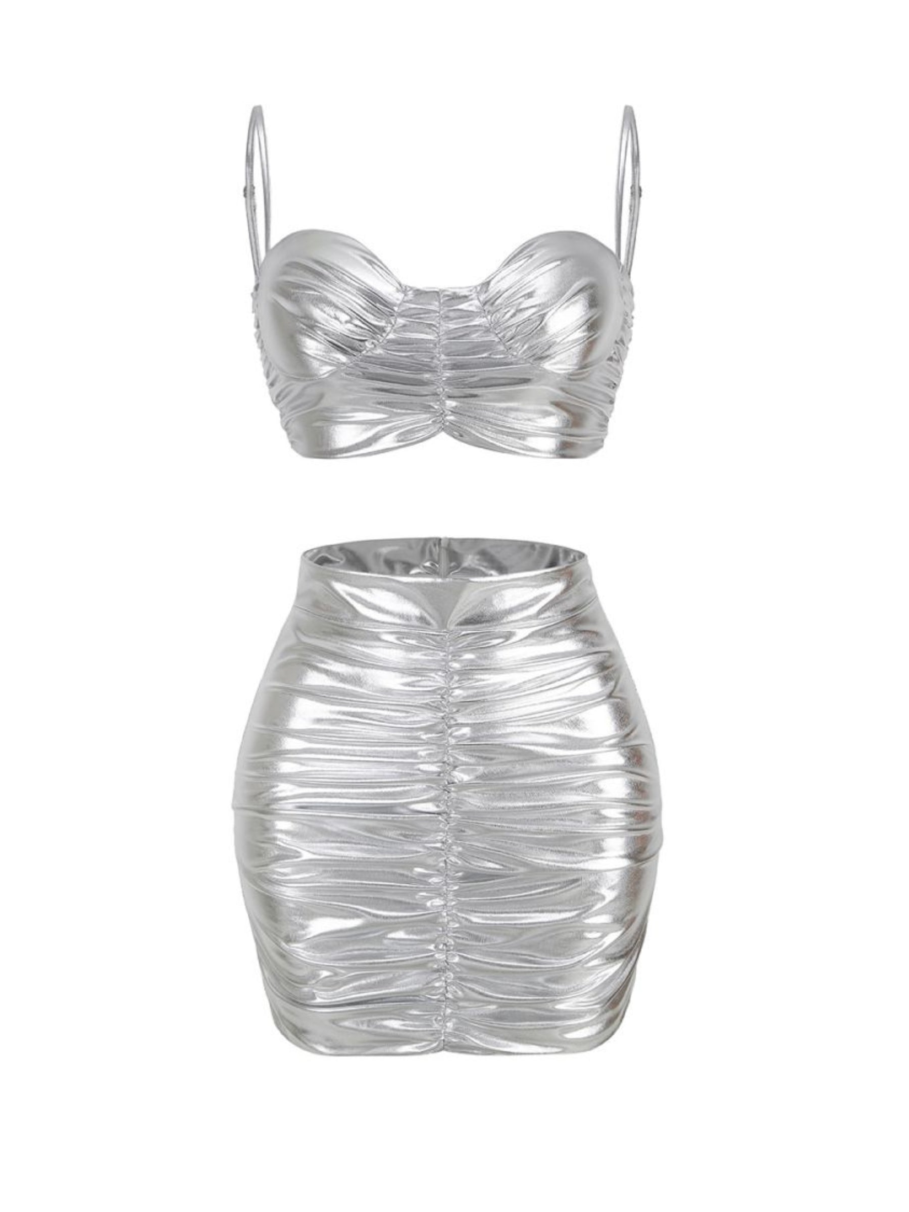 Get ready to sparkle and shine in the Sora Metallic Two Piece Skirt Set! This slim-fitting set features a high waist ruched mini dress and spaghetti straps mini crop top for a flirty touch. Perfect for any party or cocktail event. the Sora set is part of the Vivuki collection.