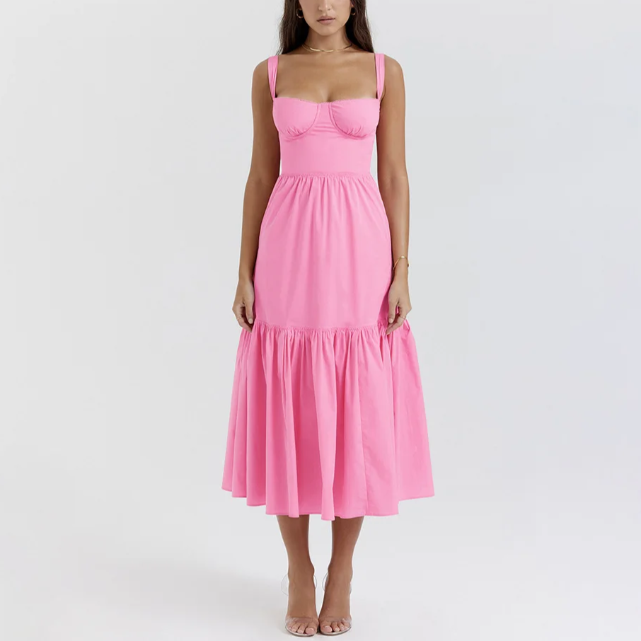 Effortless. yet sexy. this timeless Midi Dress features a tiered mid-length skirt. a bustier bodice. and a flattering open back. This dress offers a style perfect for any occasion. from romantic dinners to garden parties. with its softly gathered flattering fit. Style with gladiator sandals and a hobo bag or dress this style up with strappy sandals and a chic clutch.