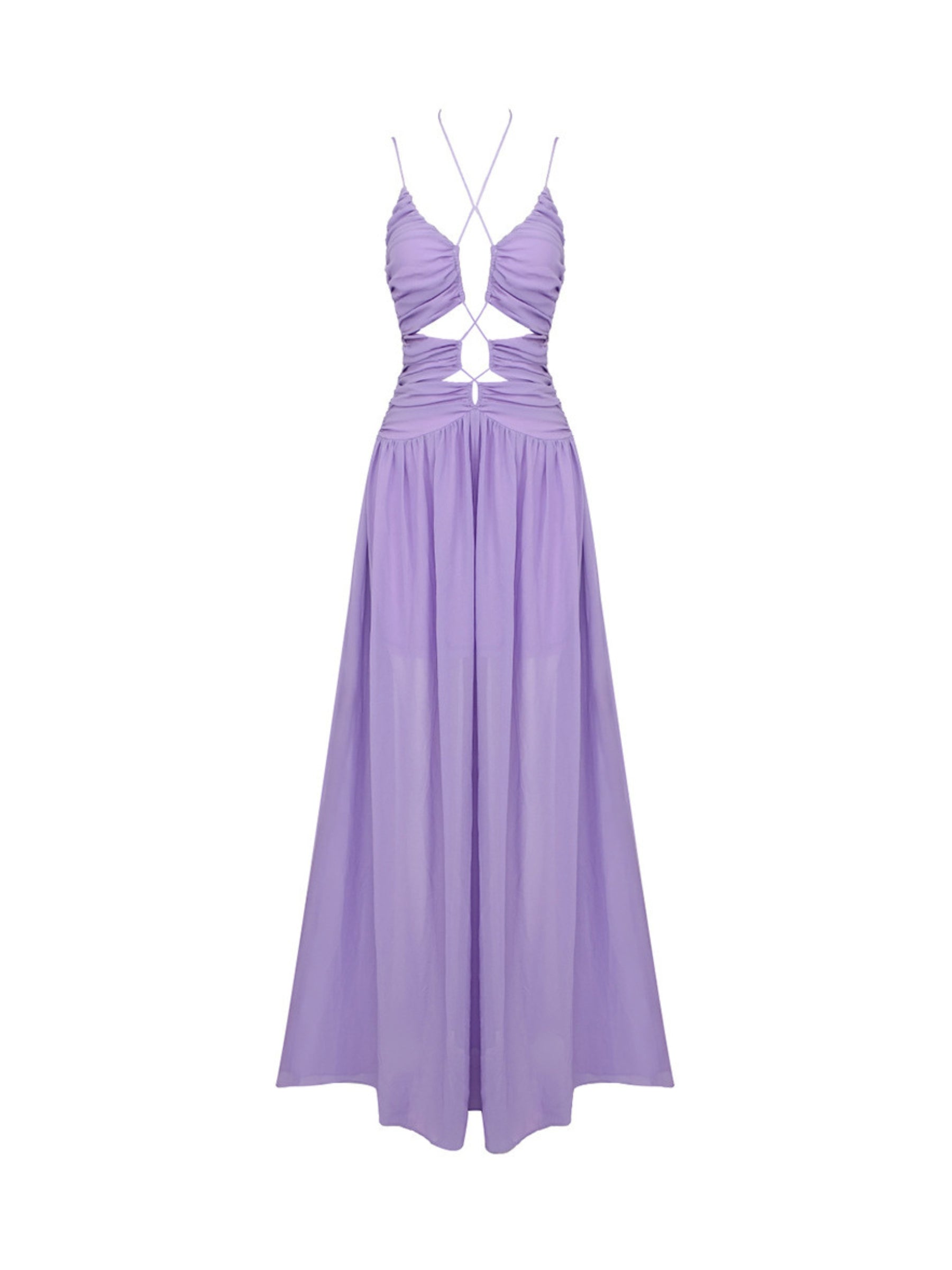Introducing the Tyra Mesh Maxi Dress in Purple. a perfect blend of contemporary design and timeless elegance. This stunning dress features delicate spaghetti straps that cross at the back. enhancing both support and style. The front showcases an eye-catching cut-out detail. highlighting the waist and creating a flattering silhouette.