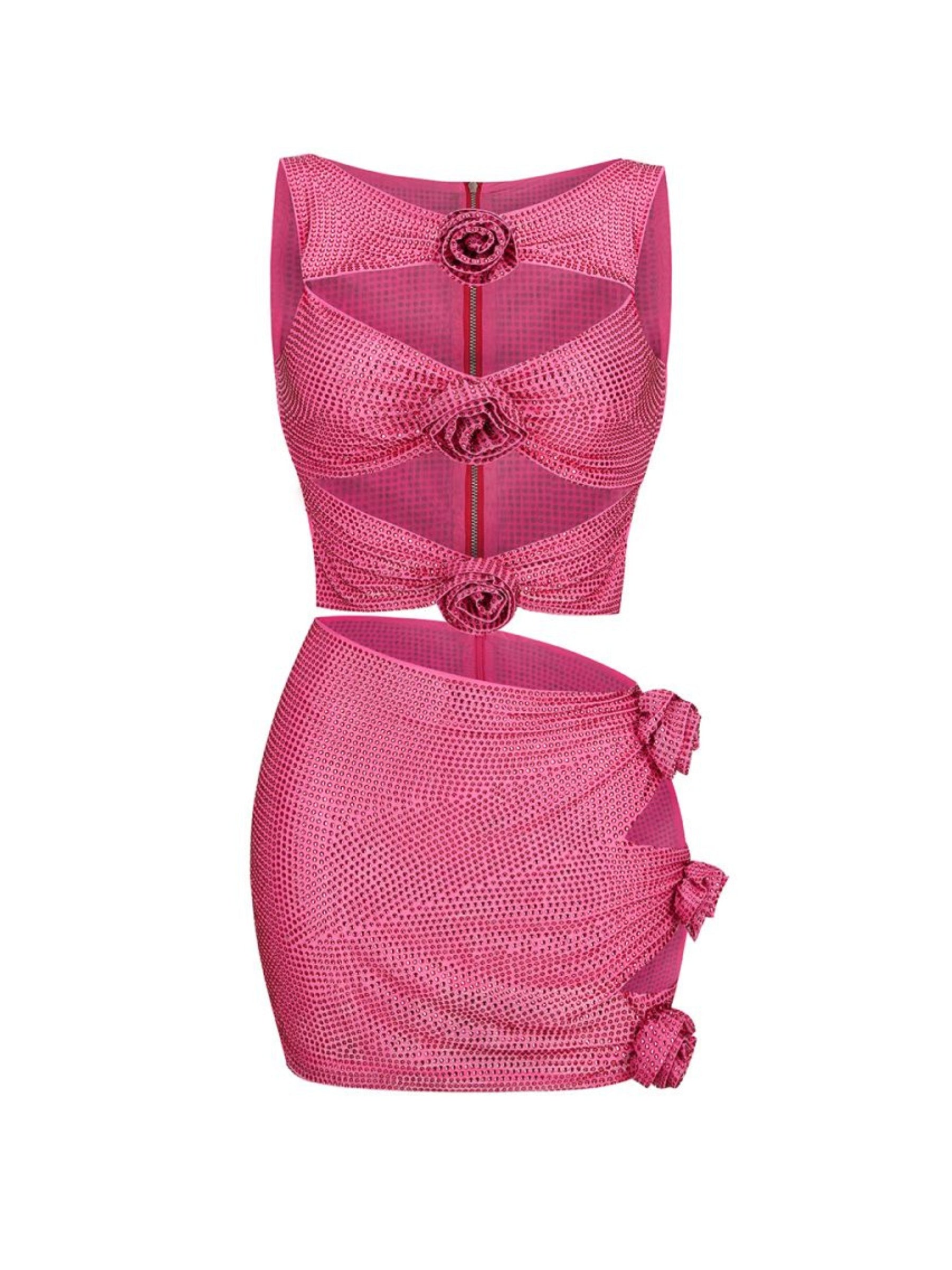 The Vanesa Embroidery Skirt Set in Hot Pink is a two piece outfit that is both sexy and stylish. The sleeveless top features a unique hollow cut design and crystal embroidery. while the elastic waist mini skirt provides both comfort and a flattering fit. Perfect for any occasion. this set is part of the Vivuki Evening Dresses Collection.