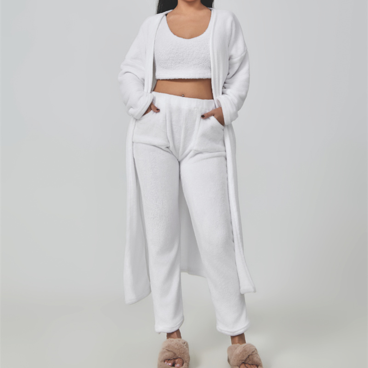 Indulge in the cozy vibes of the season with this Matching 3-Piece Pant Set. Featuring a plush long-sleeved long-style cardigan. a trendy cropped tank top. and matching luxurious pants with wide-leg styling.